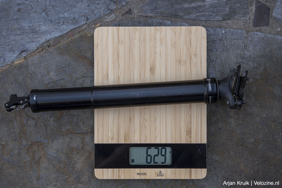 Niet alleen m’n meetlint, maar ook m’n weegschaal oordeelt in het nadeel van de nieuwe Reverb. De originele X-Fusion Manic doet 629 gram, de elektronische Rockshox-pen komt op 681 gram. Helemaal fair is deze vergelijking niet, want bij het wegen van de X-Fusion heb ik de kabel en de versteller niet meegewogen. En bij de Reverb heb ik de versteller evenmin op de weegschaal gelegd. Desondanks kan je stellen, dat de Reverb AXS grosso modo niet significant lichter of zwaarder is dan een mechanisch exemplaar. We zagen dit al eerder bij de KS LEV Circuit die Jeroen afgelopen jaar geprobeerd heeft: die komt in dezelfde lengte en diameter op een vergelijkbare 670 gram.