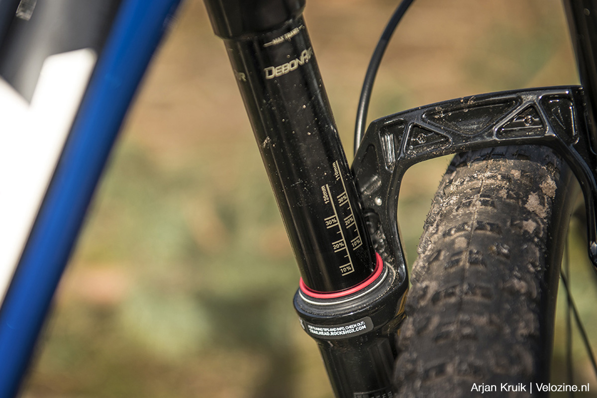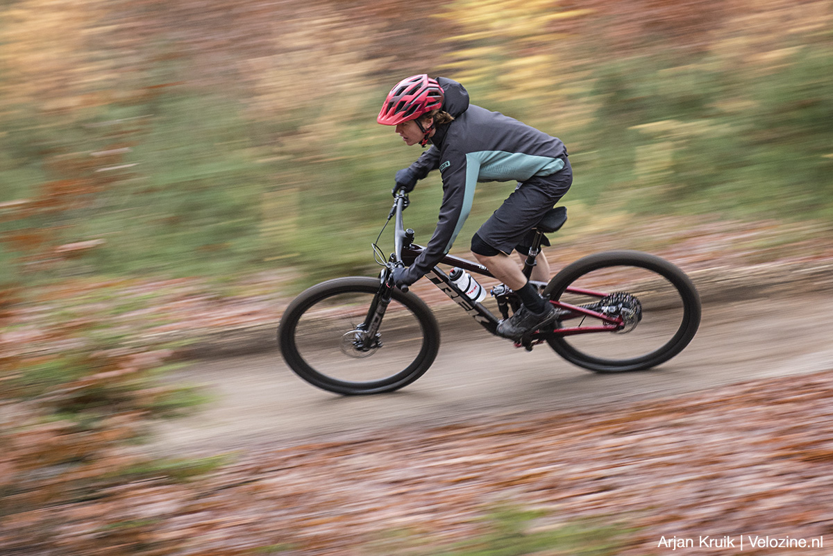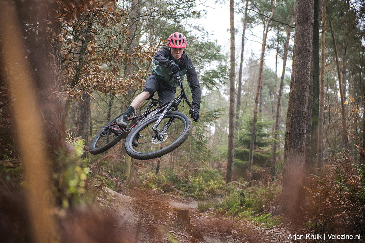 Pas als je het écht gek maakt – denk aan aflopende bochten met meer wortels en stenen dan je lief is – lijkt de vork wat te verharden. De geringe veerweg speelt hier zeker een rol, maar ook van de demper kan je teveel vragen. Die Charger Raceday-demper is zoals gezegd fijn, maar ook erg klein. Dus superkrachten heeft-ie niet en als het écht tekeer gaat dwing je ‘m wel door de knieën. Om misverstanden te voorkomen: op Nederlandse parkoersen gebeurt dit eigenlijk niet, daarvoor zijn onze trails niet ruig en zeker niet lang genoeg.