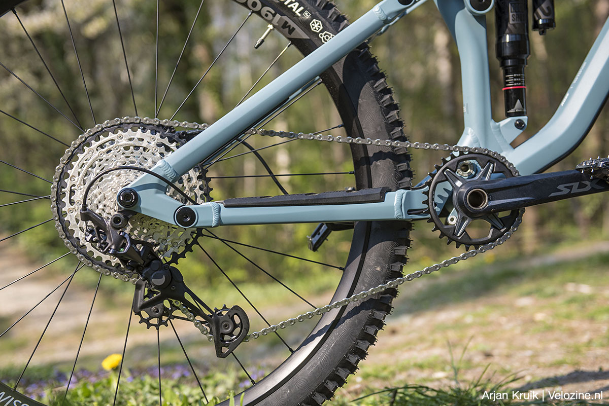 Puntje van aandacht is wel de ingaande demping van de Rockshox Super Deluxe. Ik heb het gevoel dat die af fabriek wat te stevig is afgesteld voor mijn relatief lage gewicht van 67 kilo. Daardoor is er, ondanks een sag van net iets meer dertig procent, toch sprake is van een lichte onbalans tussen de wat stugge achterkant en de juist soepele voorkant. Bij zwaardere rijders zal dit vermoedelijk niet of veel minder spelen.