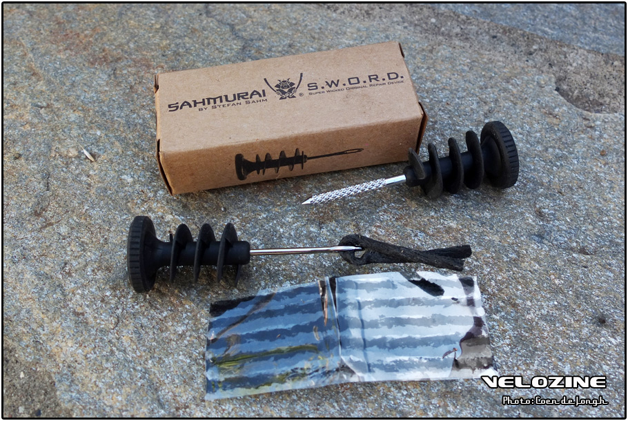 Je kan het ook anders aanpakken door het onderweg meteen op te lossen met een plug en een bijbehorend tooltje, zoals de Sahmurai Sword bandenplugset. Daarmee benut je optimaal het tubeless-concept met de vloeibare latex en kun je je binnenband écht thuis laten.