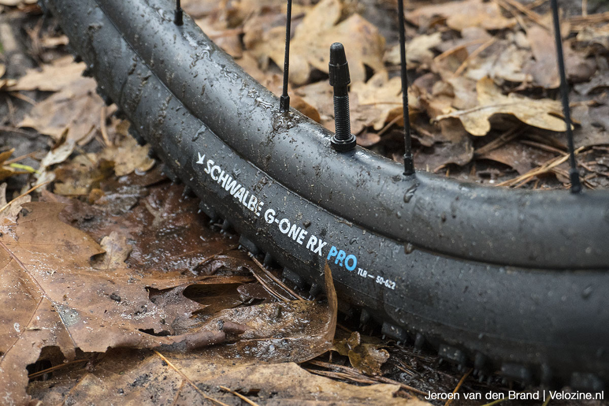 Met 1,3 bar (bij mijn gewicht van 73 kg) in de G-One RX Schwalbe’s rij ik richting mijn lokale mountainbikeroute. En hoewel de lijsters in het bos me kunnen ruiken als ik thuis een scheet laat, ligt er toch wel wat asfalt tussen mijn garagedeur en de route. Met elke pedaaltrap vanaf vertrek stijgt mijn verbazing omdat ik niet de tegendruk onder mijn pedalen voel die ik bij dit grove profiel verwacht. “Ze lopen licht, die nieuwe G-One RX-en”, zo is mijn eerste indruk. Maar mijn gedachten vullen automatisch aan met “Ik zal ze wel te hard hebben opgepompt en dat bezuurt me dadelijk op de mountainbikeroute wel.”