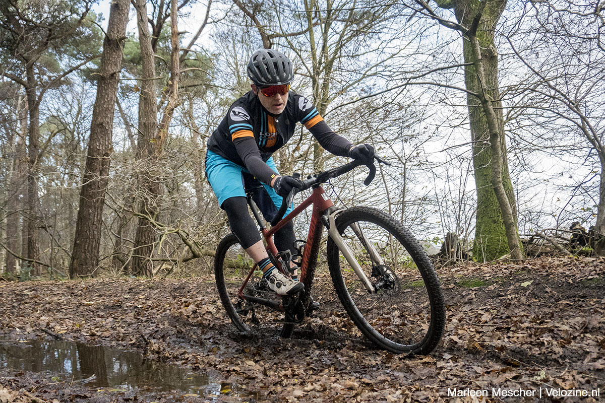 Maar ook dát vooringenomen standpunt wordt al snel de deur gewezen. Want een straat en drie bochten verder draai ik een hobbelig karrenspoor op. Niet veel later volgen de singletracks en heb ik intussen een mix van zand, modder en boomwortels onder de Schwalbe G-One RX Pro’s gehad. En de snelheid blijft er echter goed in. De interne dialoog zet zich voort: “Het zal wel de vorm van de dag zijn, dat ik op deze sloffen zo gemakkelijk mijn pedalen rondkrijg.”