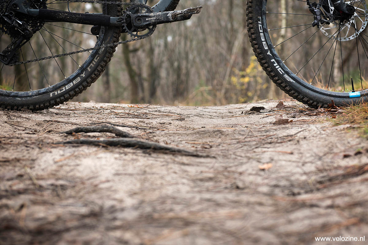 Gelukkig wel verdwenen is het vage gevoel dat de oude Nobby gaf als je je bike hard door een kuipbocht drukte. Om dit wegknikken (en soms zelfs burpen) tegen te gaan moest de vorige generatie Nobbies stevig opgepompt te worden. De stevigere wangen van het huidige model maken een lagere luchtdruk mogelijk, zonder in te leveren op stuurprecisie. Een en ander is natuurlijk afhankelijk van je gewicht, je rijstijl en het terrein, maar ik kon met mijn gewicht van net iets meer dan 65 kg bij de achterband probleemloos zo’n 0,3 bar zakken, naar 1,5 bar. Met alle voordelen die dat biedt op het gebied van bochtengrip en tractie bij remmen en klimmen. Overigens, ondanks dat de wangen van de Nobby Nic Super Trail stugger zijn, zijn ze niet té stug. De band plooit zich nog goed op de ondergrond, met een hoog rijcomfort als resultaat.