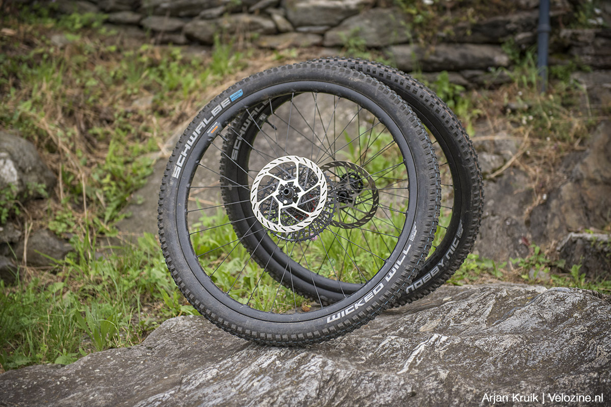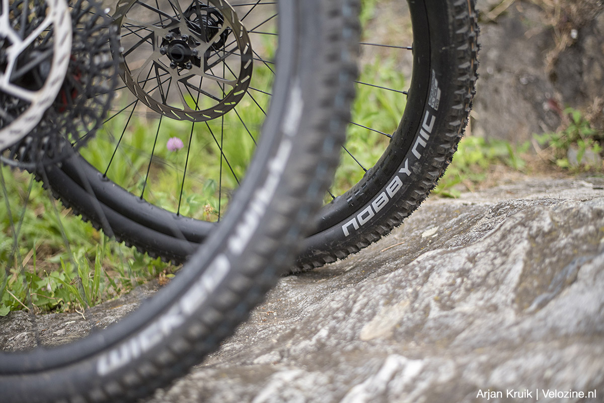 Toen Schwalbe me vroeg of ik de combinatie van Wicked Will als achterband en Nobby Nic als voorband wilde proberen, viel het nog niet mee een keuze te maken. Beide modellen worden door Schwalbe in een grote verscheidenheid aan breedtematen, karkassen en rubber-compounds aangeboden. Dat het 29 inch wordt staat buiten kijf, dat is de wieldiameter van mijn Giant Trance, de beoogde testfiets. En dat de breedte 2.4 inch wordt is ook geen punt van discussie: bij wielen met een binnenbreedte van rond de dertig millimeter moet je niet veel smaller rubber gaan rijden. De extra brede 2.6 inch uitvoering, die Schwalbe ook in z’n assortiment heeft, sla ik ook graag over. Dergelijk brede rubbers vind ik vanwege hun grote volume op een spierfiets iets te ongedefinieerd aanvoelen, zo heb ik eerder ervaren.