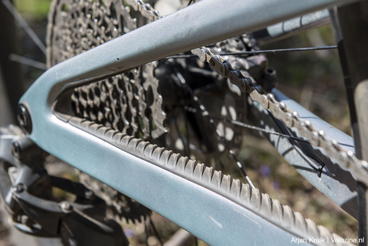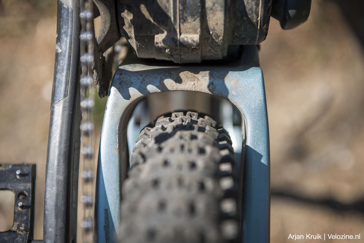 Ook als het gaat om het maximaliseren van de levensduur is geen half werk geleverd. De belangrijkste lagers zijn allemaal extra groot uitgevoerd, op de verbinding tussen het voorframe en de liggende achtervork zit een flexibel plaatje dat modder en steentjes tegenhoudt en er zit een goed dempende beschermer op de liggende achtervork. De achtertrein biedt plaats aan banden tot 2.4 inch, meer dan dat wordt krap.