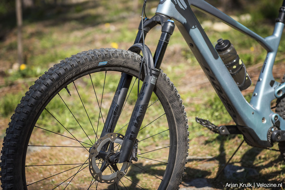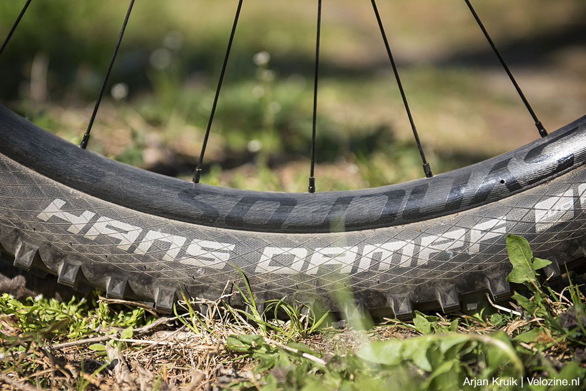 Rond het voorwiel ligt af fabriek ook een Wicked Will, maar dan met de zachtere, meer gripvaste Soft-compound. Slim! Onze testfiets werd echter geleverd met een Hans Dampf met Speedgrip-rubber. De uitdrukking “het beste van twee werelden” ken je vast. Maar bij de Hans Dampf op de testfiets is sprake van het omgekeerde: het slechtste van twee werelden. Want alhoewel die Hans Dampf vanwege de harde compound lekker licht loopt, genereren de stugge noppen op harde ondergronden veel te weinig grip. Een Hans Dampf als voorwiel? Prima, maar dan wel met Soft-compound.