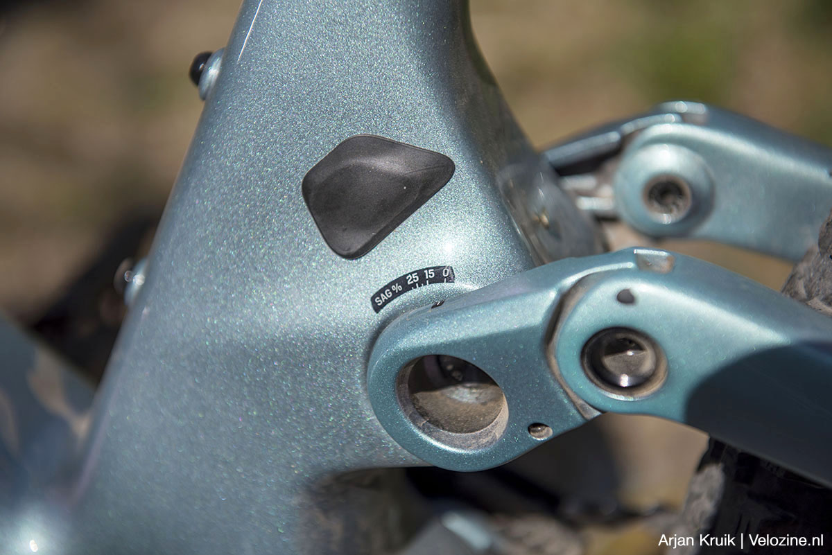 Ook slim is het wijzertje aan de buitenzijde van het frame op het hoofddraaipunt dat de negatieve veerweg oftewel de sag aangeeft. Dat werkt zeker zo goed als het klassieke O-ringetje rond de schacht van de zuiger. Het afstellen van luchtdruk is helaas wat minder praktisch dan bij een reguliere dempermontage; het ventiel is redelijk lastig bereikbaar. Dito voor de rebound; ook dit in de onderbuik van de bike verborgen stelhendeltje vraagt om lange en slanke vingers.