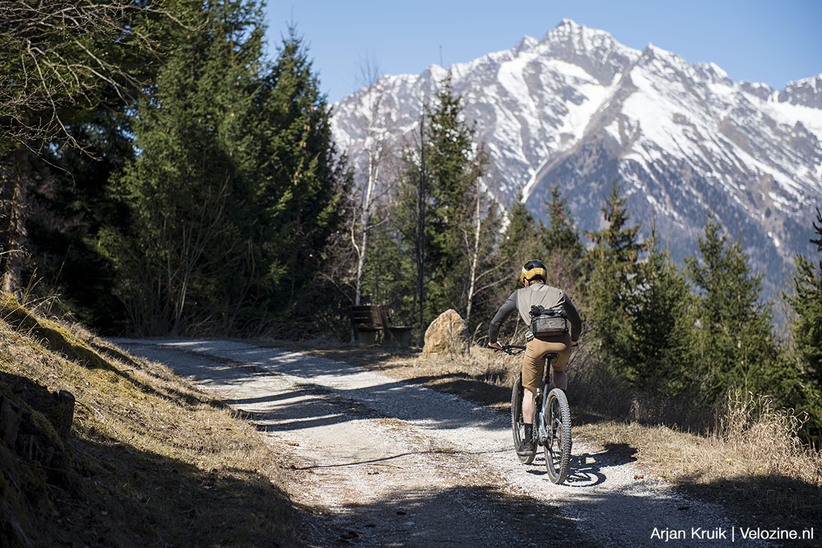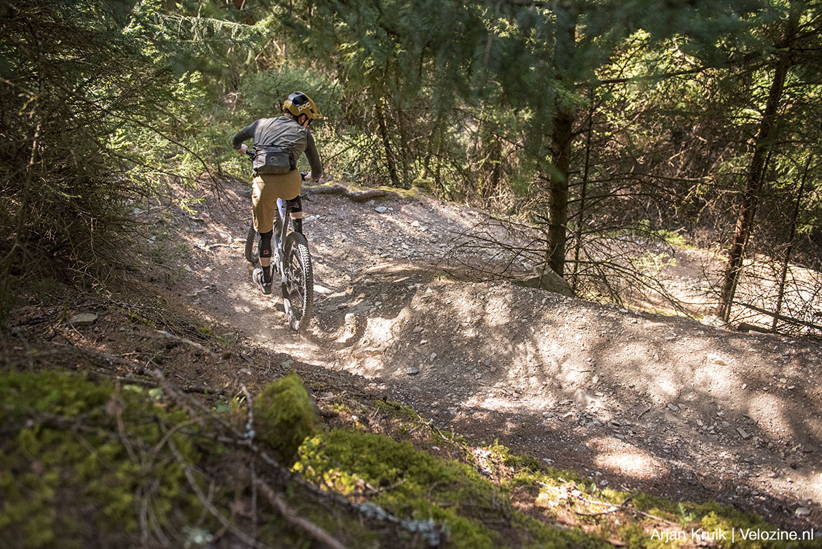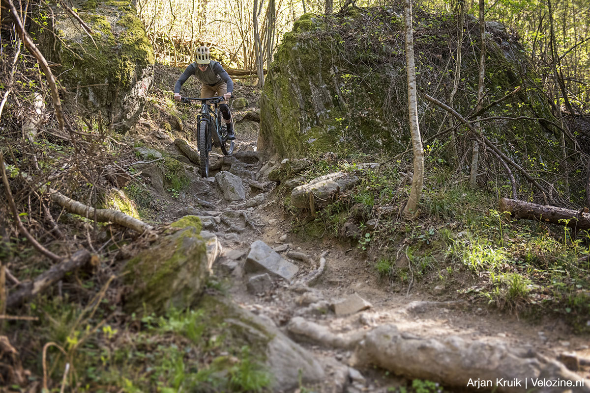 Wie omlaag wil, zal eerst omhoog moeten. De Lumen gooit dan gelijk z’n belangrijkste troef in de strijd: het Twinloc-systeem. Met de middelste hendel helemaal ingedrukt gaat de voor- en achtervering nagenoeg op slot. Bovendien blijft de fiets in die stand vanwege het gereduceerde luchtvolume in de demper hoog in z’n veerweg staan, waardoor de zitbuis niet naar achteren wegzakt en een efficiënte zitpositie gewaarborgd blijft. Crosscountry efficiënt zelfs, waardoor ik de geasfalteerde aanloop waarmee de tocht begint in een vlot tempo kan afraffelen. Het harde, snelle rubber van de Schwalbe-rubbers is daarbij zeker geen nadeel. Integendeel, ik heb niet het idee dat ik veel harder moet trappen dan m’n tochtgenoten met hun toch echt véél dikkere motoren.