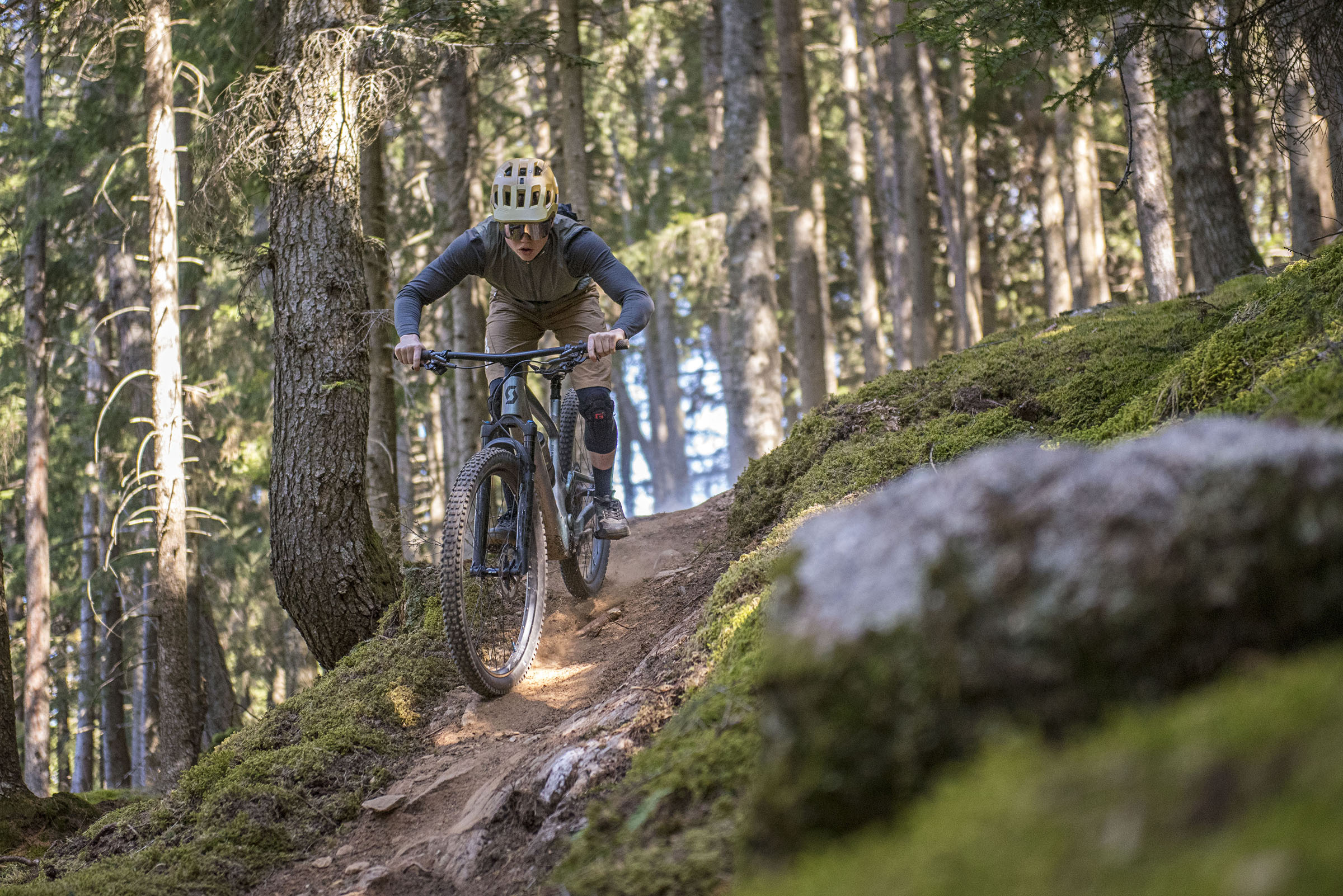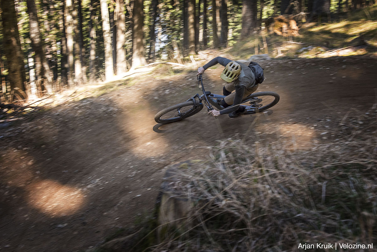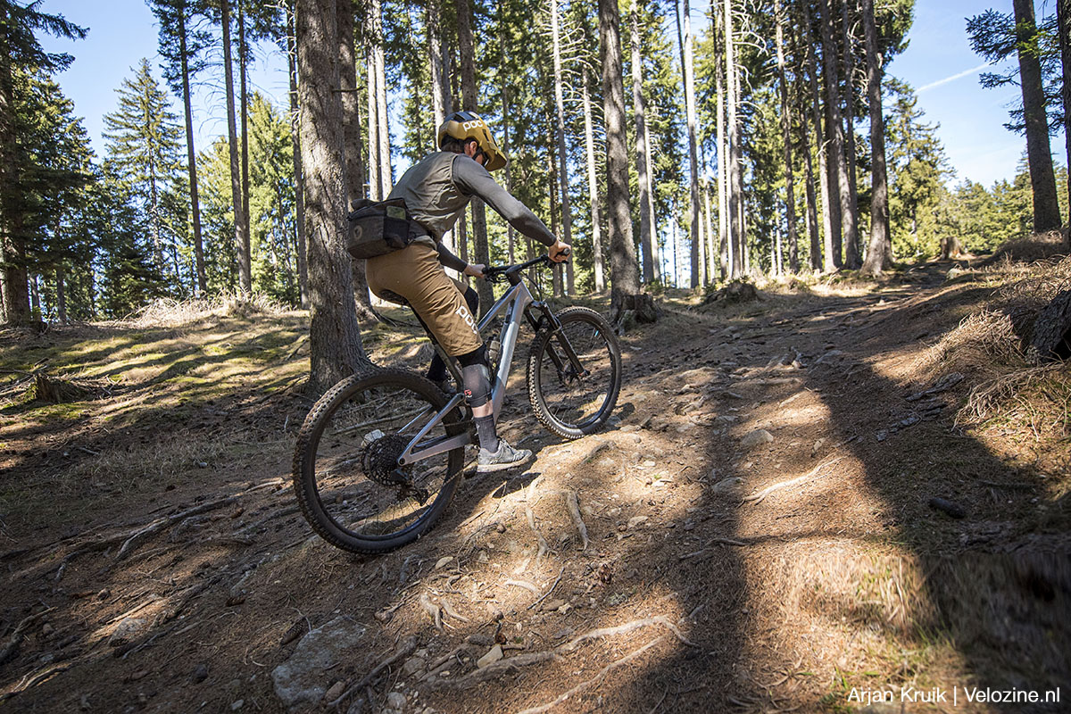 Even boven de 1.700 meter gaat de weg over in een trail. Een stukje omhoog, dan weer omlaag. Soms glad en vloeiend, dan weer steil en stenig. In de vloeiende secties is de Lumen het meest in z’n element. De fiets neemt makkelijk snelheid mee, waardoor je goed je momentum houdt. Maar de eigenschappen op lastige paden vallen ook helemaal niet tegen. In de technische klimmetjes is de tractie die de achtervering genereert verrassend goed, terwijl de fiets niet wegzakt in z’n veerweg. Echter, met z’n geringe profiel en harde rubber geeft de Wicked Will niet dat gevoel van eindeloze grip dat banden met grovere noppen en zachter rubber wel weten te bewerkstelligen.