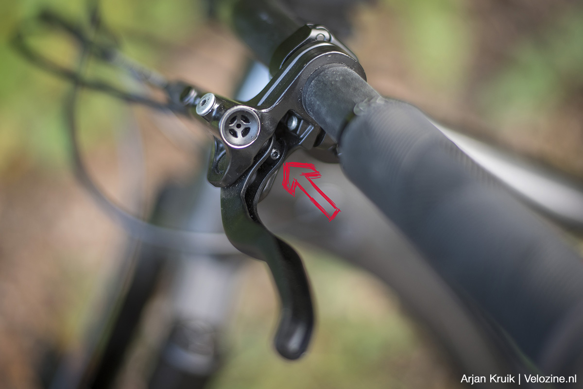 Het eerste dat ik heb gedaan is de remhendels zoveel mogelijk naar binnen plaatsen. Daarmee verandert de lange tweevingerremgreep feitelijk in een éénvingerremgreep. En doordat die ene vinger helemaal aan het eind van de extra lange remhendel aangrijpt, beschik je over een lange hefboom en kun je veel druk uitoefenen op de zuiger die de remolie door de leiding naar de dubbele remklauw perst. Als je ook dit soort remmen op je bike hebt moet je het maar eens proberen, je merkt gelijk het verschil.