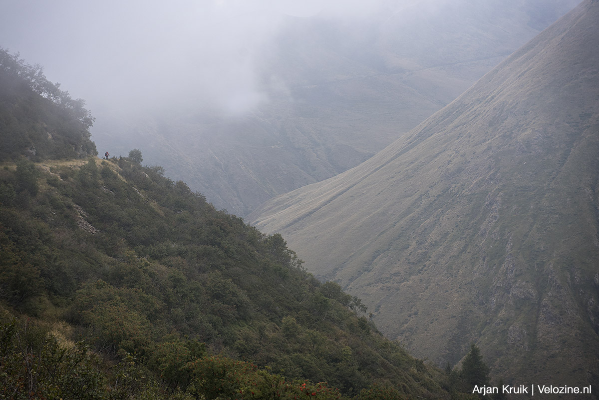 De laatste 300 hoogtemeters tot de pashoogte zijn niet alleen stenig, maar met stijgingspercentages tussen 12 en 22% ook gemeen steil. Hier is het belangrijk bijtijds terug te schakelen, de EP8-motor voelt zich het best bij zo’n 70 tot 90 omwentelingen per minuut. Maar nadat ik naar een lichter verzet ben gegaan, schakel ik toch over naar de trail-stand, met name om makkelijker over de grote keien te kunnen rollen. Die zuigen namelijk kracht; niet alleen uit m’n benen, maar ook uit de accu. Die extra ondersteuning heeft daarom wel een prijs; al na 250 hoogtemeters zakt de inhoud van de accu van drie naar twee streepjes. Maar goed, de rest volstaat om helemaal boven te komen en nog wat reservesap over te houden ook. Ruim 1.800 hoogtemeters op één acculading; dat had ik niet verwacht.