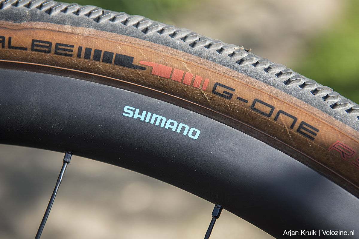 De binnenbreedte van de velg is 25 millimeter. Dat is breed genoeg om ook gravelbanden met een breedte van meer dan veertig millimeter mooi te laten staan. Zoals m’n geliefde G-One RS van Schwalbe, die ik bij voorkeur in de 45 millimeter brede uitvoering rijd. Opvallend is dat de flank van de velg is voorzien van een conventioneel haakprofiel om de hieldraad van de band vast te houden. De hookless-trend laat Shimano dus aan zich voorbij gaan. Op zich niet zo gek: door de velgen met een haakprofiel uit te voeren, weet Shimano zeker dat de meeste banden probleemloos zullen passen.