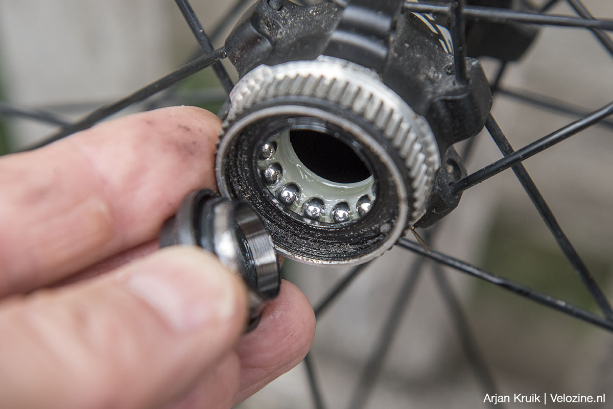 Een groot verschil met naven van Shimano en bijna alle andere naven: je kunt ze zelf redelijk makkelijk onderhouden. Bij de door de Japanse onderdelenmaker traditioneel toegepaste cup-en-conuslagers kun je namelijk niet alleen zelf de lagerspanning instellen, maar kunt je eveneens zelf de lagers schoonmaken en opnieuw in het vet zetten. Benodigdheden: twee conussleutels nummer 17. Ik heb de lagers na anderhalf duizend kilometer geopend om ze te bekijken. In het linker lager is het vet nog maagdelijk wit, rechts lijkt gezien de verkleuring wat vuil binnengedrongen en is een schoonmaakbeurt niet overbodig. Al met al best verrassend, want cup-en-conuslagers hebben de reputatie gevoeliger te zijn voor het binnendringen van vuil dat geheel afgedichte industrielagers. De lagers van deze GRX-wielen – zeker het linker – laten zien dat dat niet per se waar is.