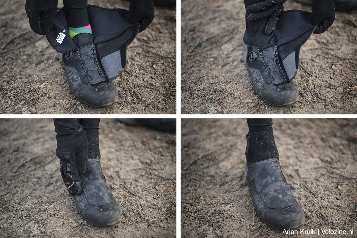 Als het gaat om het tegenhouden van water zijn de Shimano MW7’s echt heel goed. De combinatie van overlappende flappen en Gore-tex-voering werkt voorbeeldig. En water dan dat via je benen naar binnen sijpelt? Ja, dat gebeurt. Maar dankzij het nauwsluitende neopreen is die hoeveelheid echt zeer gering. Plus: als je goede sokken draagt – ik heb altijd dunne sokken aan van soepele merinowol – dan heb je van die paar druppeltjes geen last. Maar draag nóóit katoenen sokken in deze schoenen, want katoenvezels zuigen het water letterlijk de schoen in.