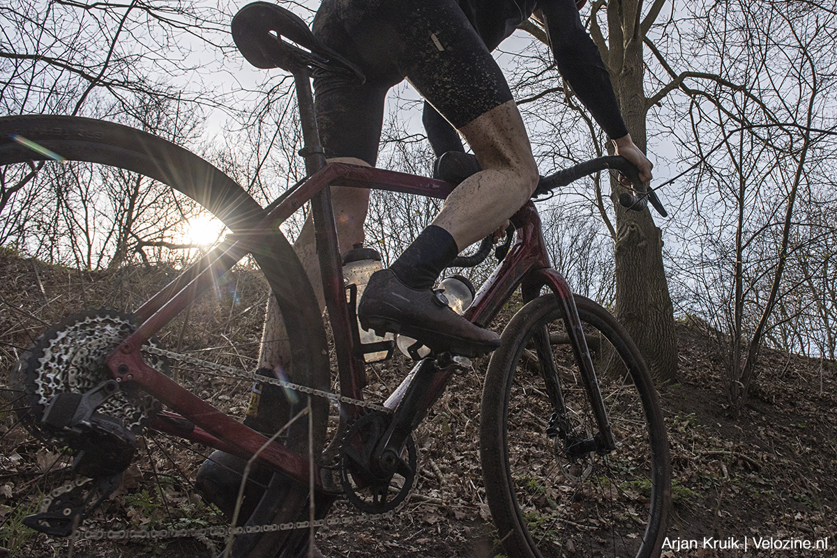 Fijne gravelschoenen, die RX8’s van Shimano. Superlicht, superstijf en – ondanks hun focus op competitief gebruik – ook comfortabel. Heb ik zulke super-de-luxe schoenen nodig? Natuurlijk niet. Met de afstanden die ik afleg en de wattages die ik wegtrap, zou een goedkopere, minder lichte en minder stijve schoen ook gewoon dikke prima zijn. Maar aan de andere kant: ondanks dat de schoenen op alle vlakken meer bieden dan ik eruit kan halen, heb ik geen nadelen ervaren. Zelfs de extreem stijve zool hindert niet. Althans, tijdens het fietsen. Als het gaat om lopen is een wat meer soepele zool natuurlijk altijd fijner.