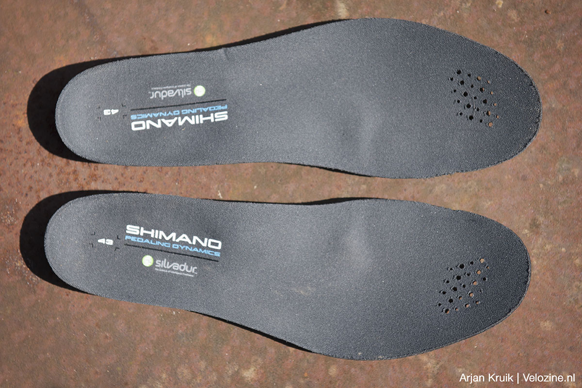 De inlegzooltjes in de RX8’s zijn beter dan gemiddeld. Het bovenmateriaal van de zooltjes is zool antibacterieel behandeld, waardoor nare geurtje minder snel optreden. Maar belangrijker voor fietsbeleving zijn de hielkuip en de voetboogondersteuning. De voor een confectiezooltje redelijk geprononceerde hielkuip houdt de hiel op zijn plaats en stabiliseert daarmee de rest van de voet. En de door middel van klittenband afneembare voetboogondersteuning komt in twee soorten: geel voor normale voeten en rood voor voeten die meer voetboogondersteuning nodig hebben. Hiermee komen de Shimano-zooltjes in de buurt van losse after-market inlegzolen.