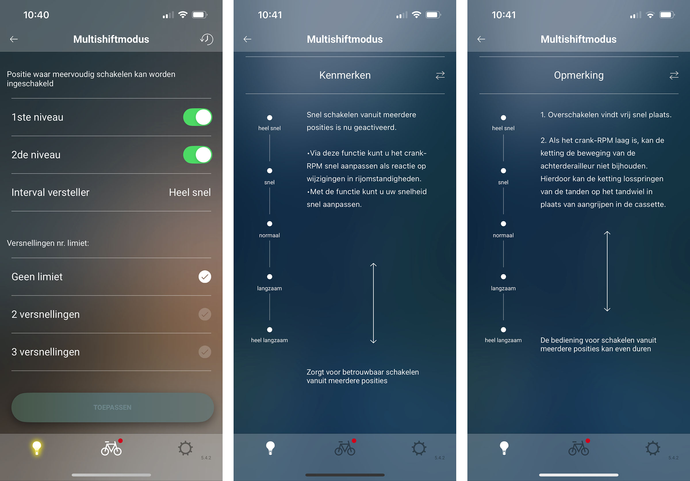 Ik heb blijkbaar een gemiddelde trapcadans. Als ik de instelling vertraag, is de schakelsnelheid van de derailleur namelijk zo traag dat schakelen met enorm veel twijfel lijkt te gaan. Veel geratel omdat de ketting simpelweg minder vlot wordt gedirigeerd. Pak ik standje vijf van vijf, dan schakelt de derailleur dusdanig snel, dat de ketting bijna nooit tijd heeft mooi van de ene krans naar de andere te in te lopen. Ook een hoop geweld en geluid als gevolg.