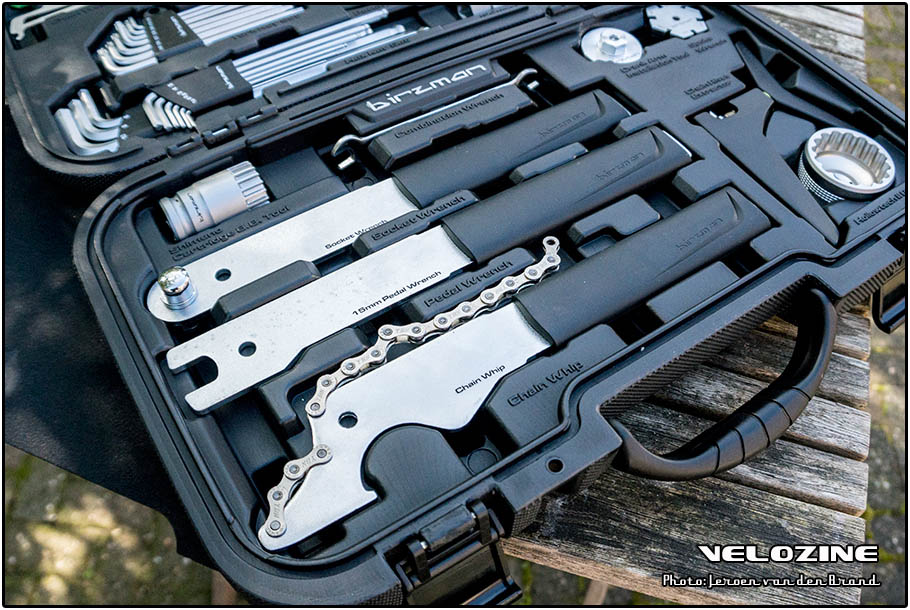 Naast een platte en kruiskop schroevendraaier is er een inbusset, inclusief fatsoenlijk grote 10 mm inbus voor die weerbarstige crankbout. Een torx-set mag uiteraard ook niet ontbreken, evenals een spaaksleutel. Verder bevat de set een degelijke kabelkniptang, een lange pedaalsleutel en een lange sleutel om de verschillende doppen op te zetten. Naast de al genoemde dopsleutel voor de cassettelockring (Shimano-stijl, dus ook geschikt voor je Sram cassette), zijn er ook doppen voor Campagnolo cassettes én de in- en uitwendige vertande Shimano bottom brackets, waarbij die laatste ook past op de lockring van je Centerlock schijven. Een crankafnemer ontbreekt ook niet.