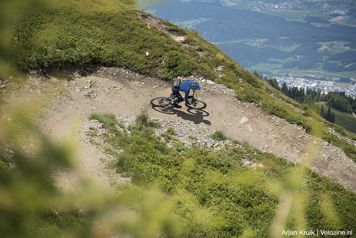 Afgelopen lente- en zomermaanden zijn m’n Raaw en dus ook de Butcher en de Eliminator meerdere keren mee geweest naar de Alpen. Plan de Corones in Italië, Lenzerheide in Zwitserland, Saalbach-Hinterglemm in Oostenrijk. Ik heb daar zowel over wandelpaden en onverharde bergwegen gereden als over speciale biketrails. Klimmen is in eerste instantie een tegenvaller, maar dat is klimmen met een zware trailbike in mijn beleving eigenlijk altijd, zeker als je van een lichtgewicht crosscountry-bike met dito banden komt. Je moet je hoofd als het ware weer even opnieuw kalibreren. Maar eenmaal aan de nieuwe set-up gewend, valt het omhoog peddelen helemaal niet tegen.
