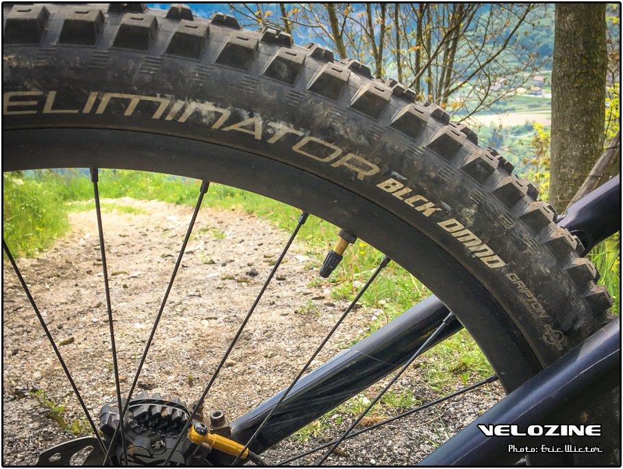 Op pad kan het BLCK DMND karkas je niet ontgaan. De band is merkbaar zwaarder dan een normale licht verstevigde Specialized GRID, Maxxis EXO of Schwalbe DoubleDefense versie. Een belangrijk punt van een verstevigd karkas als BLCK DMND is dat je minder stootlek rijdt en daarmee in gladde omstandigheden de druk verder kan verlagen. Doe je dat dan neemt logischerwijs je rolweerstand toe maar of dát in zulke omstandigheden je grootste zorg moet zijn betwijfel ik. Het noppenprofiel lijkt wel ietsje beter te rollen dan dat van een vergelijkbare Maxxis DHRII of DHF. Dit alles betaalt zich doorgaans wel terug als je eenmaal hard bergaf gaat in rotsachtig terrein, of als je omwille van de grip je druk flink moet verlagen. Wij zijn tot 1,4 bar (75 kg rijder) respectievelijk 1,8 bar (90 kg rijder) gezakt in anders griploze omstandigheden, meer was niet nodig. Uiteindelijk hebben we de de achtervelg wel een keertje of twee gevoeld, maar er was geen schade en zeker ook geen lekkage.