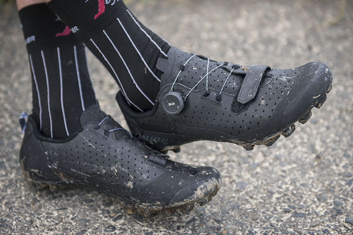 Het bovenwerk van deze offroad-sloffen is voorzien van een grote hoeveelheid kleine gaatjes. Die dienen enerzijds ter ventilatie, maar moeten anderzijds het op zich redelijk stugge bovenwerk wat souplesse verlenen. Boven de tenen lopen die perforaties dwars op de schoen. Het idee daarachter is dat de schoen op die plek, daarbij geholpen door de eveneens soepele zool ónder de tenen, beter kan afrollen tijdens het lopen. Specialized heeft er zelfs een mooi woord voor bedacht: stride toe-flex technology.