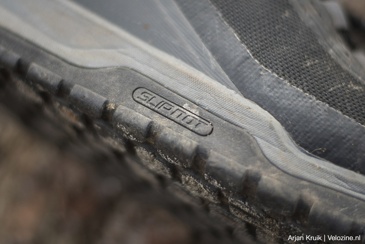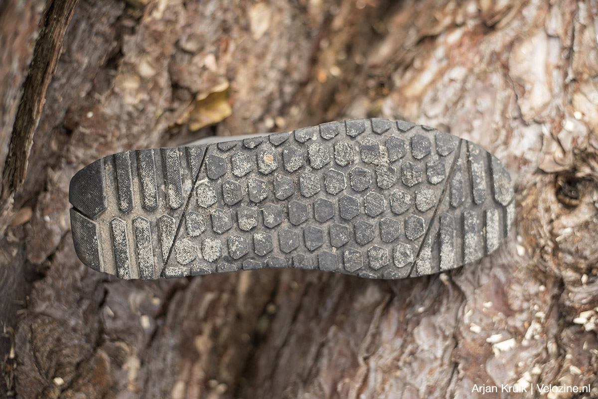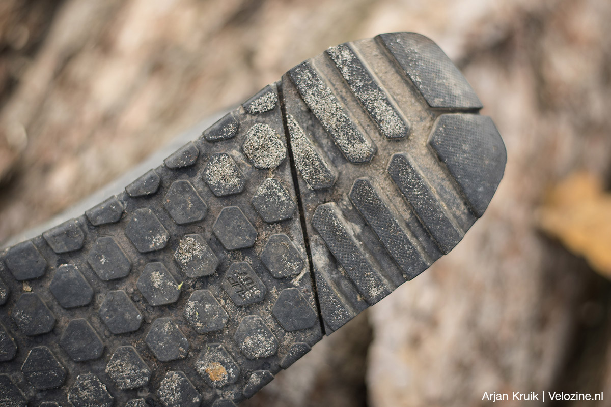 Ook het profiel van de zool is gericht op hiken. Dat wil zeggen, bij de voor- en achtervoet. Daar is een redelijk geprononceerd blokkenprofiel aangebracht dat in steile klim- en afdaalpassages voor tractie moet zorgen. Bovendien is daar ook de rubbersamenstelling anders. Heeft Specialized onder de bal van de voet en de voetboog – zeg maar het deel van de zool waarmee je op de pedalen staat – z’n extreem gripzekere maar tevens niet al te slijtvaste SlipNot ST-rubber aangebracht, bij de voor- en achtervoet is het rubber iets harder en daardoor ook duurzamer.