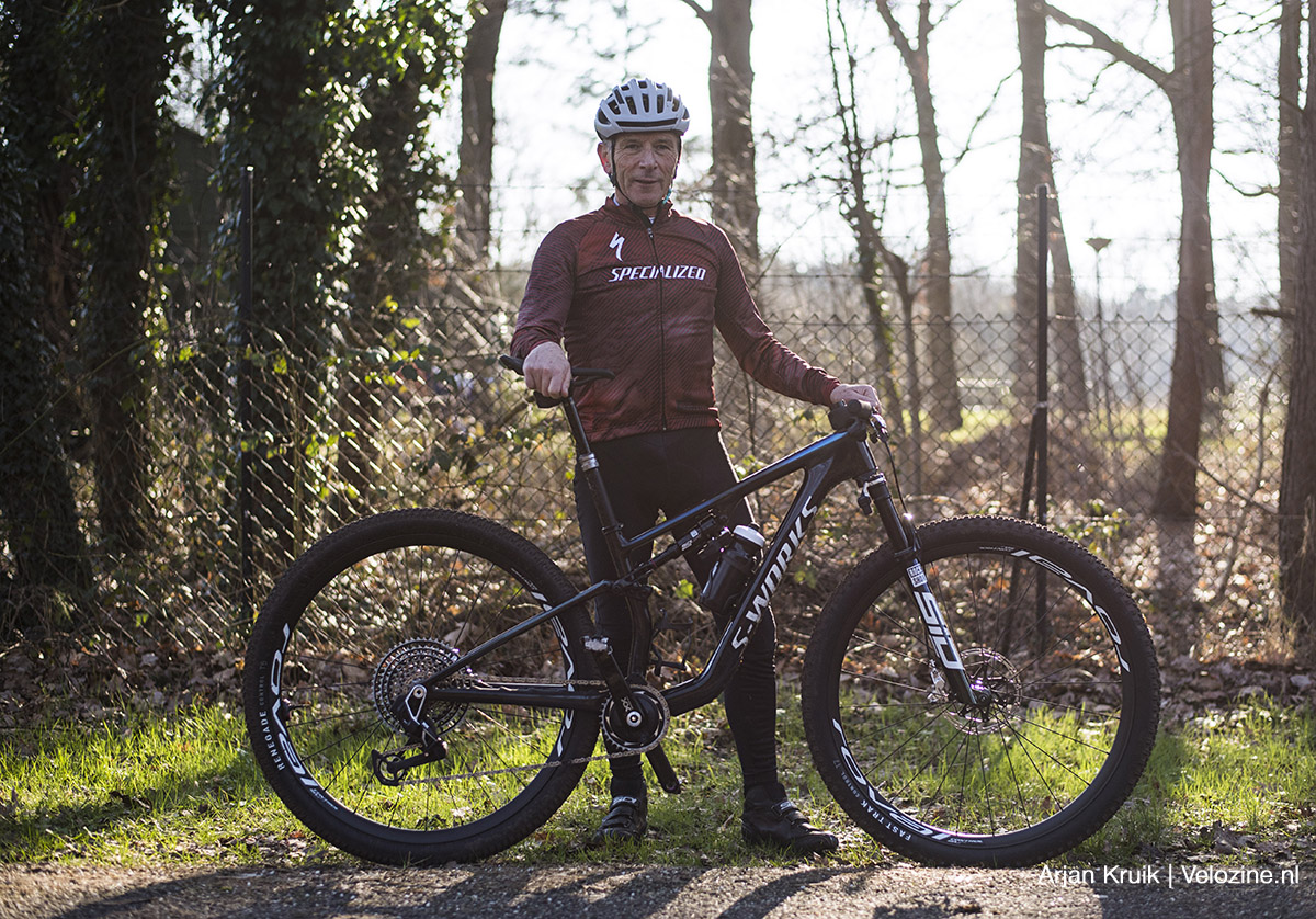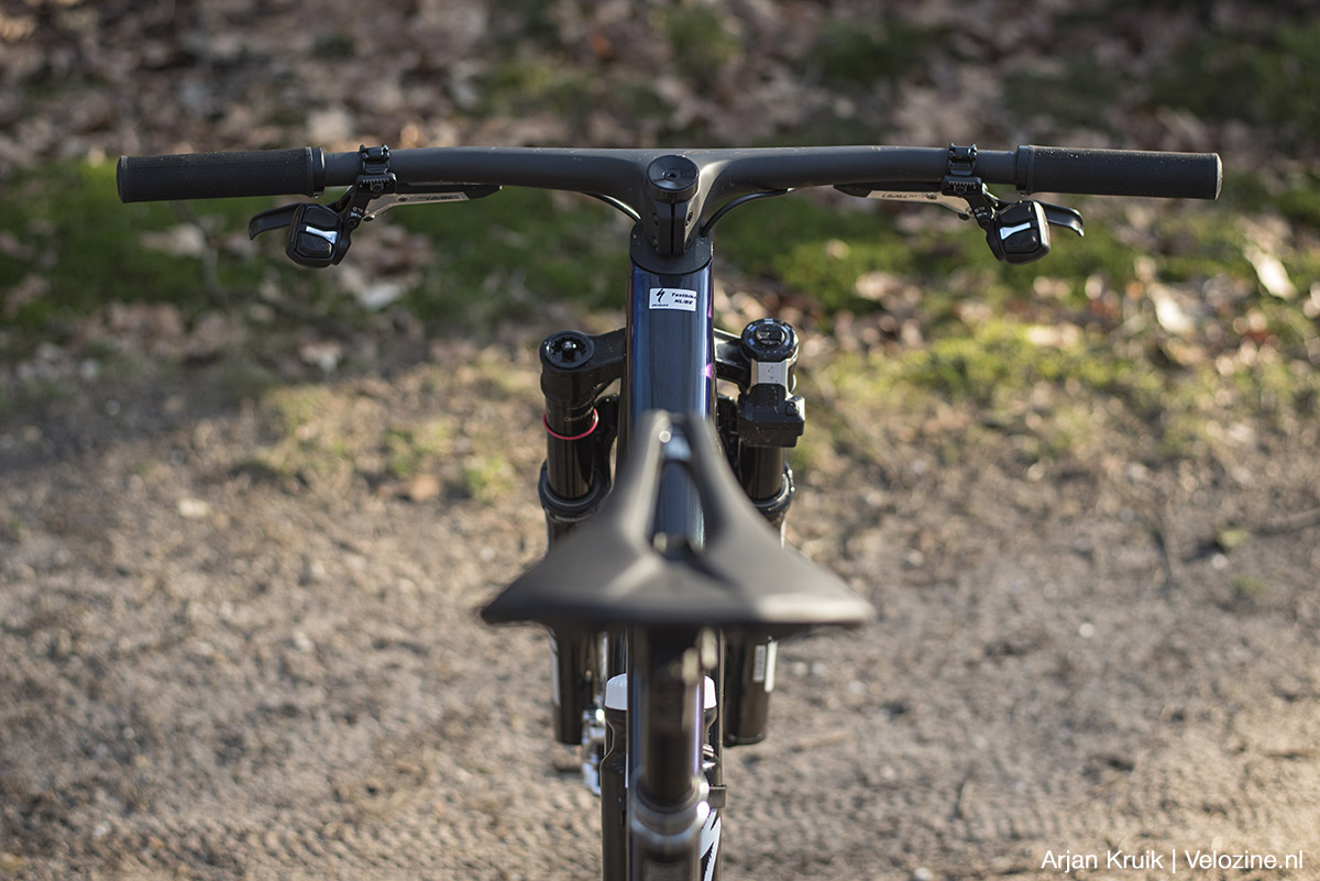 Nog even over de maat. Die van mijn eigen Epic heb ik bepaald met behulp van een Retül-meting bij m’n fietswinkel. Met een lengte van 170 centimeter bleek ik bij Specialized tussen de maten S en M in te vallen. Omdat ik graag op een wendbare bike rijd, ben ik toen voor de S gegaan. Die m’n dealer vervolgens, dat moet ik er wel even bij vertellen, precies passend heeft gemaakt met een iets langere stuurpen en een zadelpen met set-back. Omdat ik de S-Works Epic 8 in de fabriekssamenstelling heb gereden, dus met een stuurpen van slechts 60 millimeter en een zadelpen met rechte kop, is de zit een paar centimeter korter dan op mijn eigen fiets. Compleet anders is het uitzicht vanaf het zadel; vanwege de luie balhoofdbuishoek en de korte stuurpen staat het voorwiel veel verder naar voren.