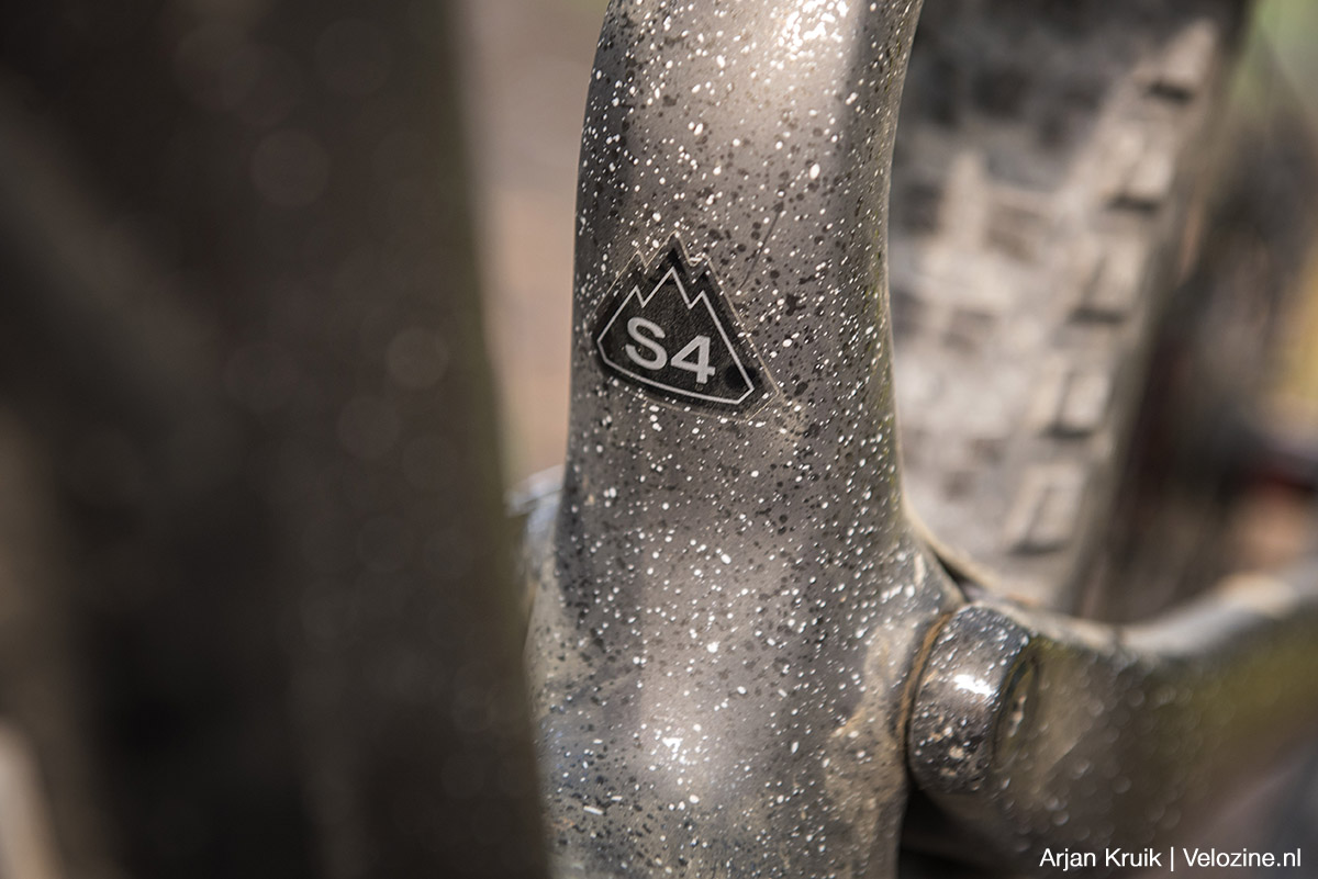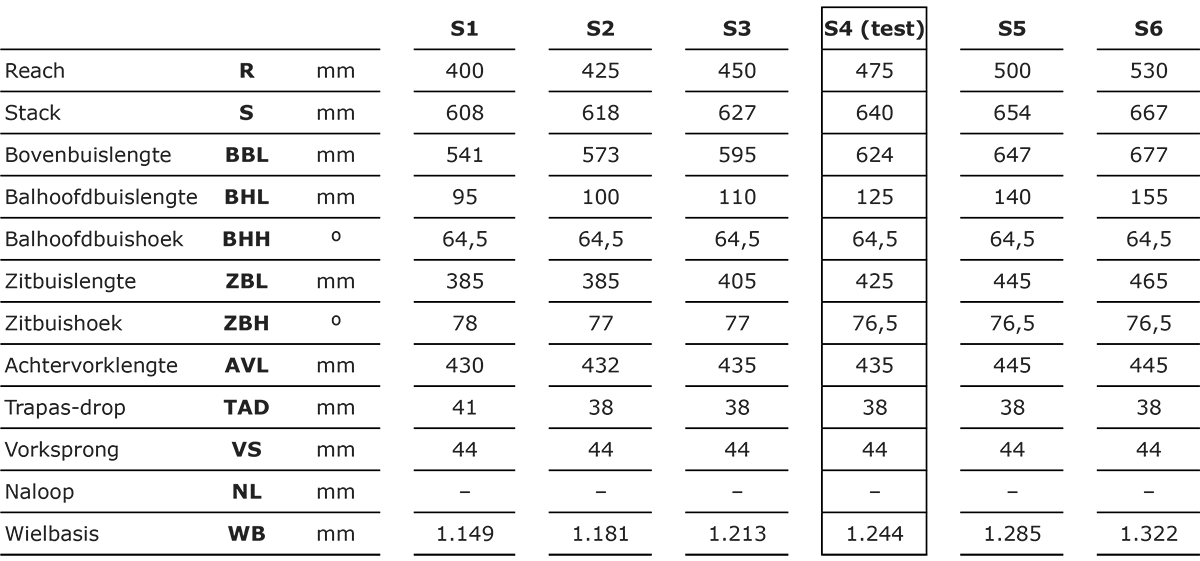 Kijk maar even mee naar de rest van de maten. In onze framemaat S4 is de wielbasis 1.244 millimeter, meet de bovenbuis 624 millimeter, zijn de zit- en balhoofdbuishoek respectievelijk 76,5 en 64,5 graden en bedragen reach en stack respectievelijk 475 en 640 millimeter. De balhoofdbuis is 125 millimeter lang, de liggende achtervork meet 435 millimeter en de trapas staat 38 millimeter lager dan de denkbeeldige lijn door de wielassen. De zitbuis meet 425 millimeter, zodat er ruimte is voor droppers met een groot verstelbereik .