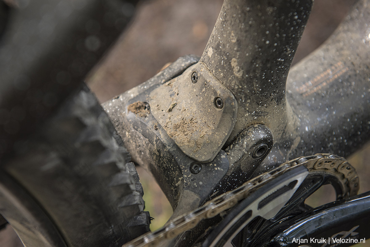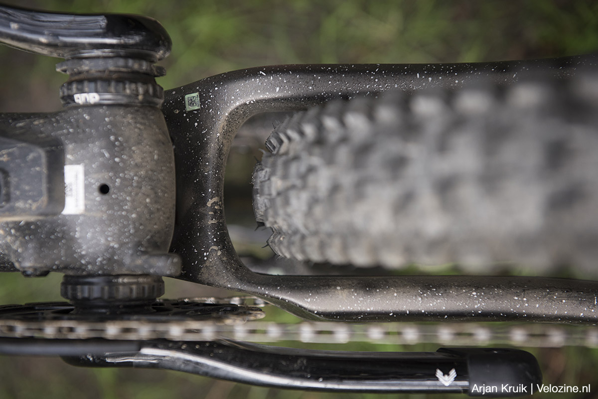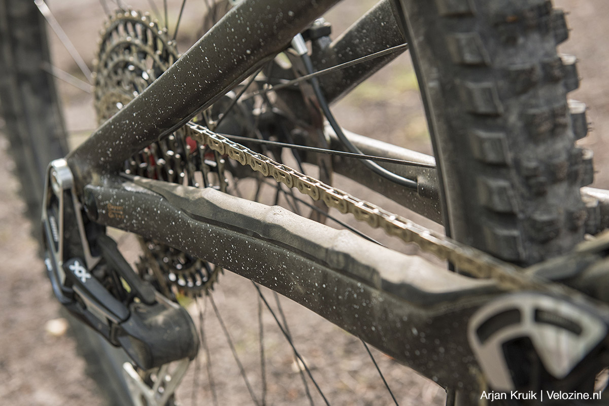 De flipchip in de liggende achtervork heb ik wél gebuikt. En ondanks dat een verschil van 6 millimeter in absolute zin nogal klein lijkt, maakt het qua rijgevoel wel degelijk uit of je de liggende achtervork op 435 millimeter of op 441 millimeter lengte hebt staan. Met de liggende achtervork in de lange stand komt namelijk ook de trapas 7 millimeter lager te staan. Doordat de fiets dus niet alleen lánger wordt, maar ook láger komt te staan, neemt de stabiliteit merkbaar toe. Met name in snelle, steile secties is dat een voordeel.