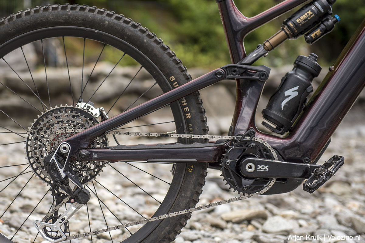 Dat wil zeggen: met de liggende achtervork in de langste stand. Dus niet 435, maar 444 millimeter. Zo is de achtervork nog steeds kort genoeg om het voorwiel makkelijk op te kunnen tillen, maar is de bike als geheel beter in balans. De Turbo Levo stuurt dan nog steeds makkelijk, maar met meer controle en grip, met name in bochten met een losse ondergrond. Ook bergop levert de langere achtertrein winst op. Gecombineerd met de steile zitbuishoek kun je in steile beklimmingen langer blijven zitten. Het voorwiel blijft beter aan de grond en vanwege de gripvaste achterband en de soepele vering is tractie gewaarborgd.