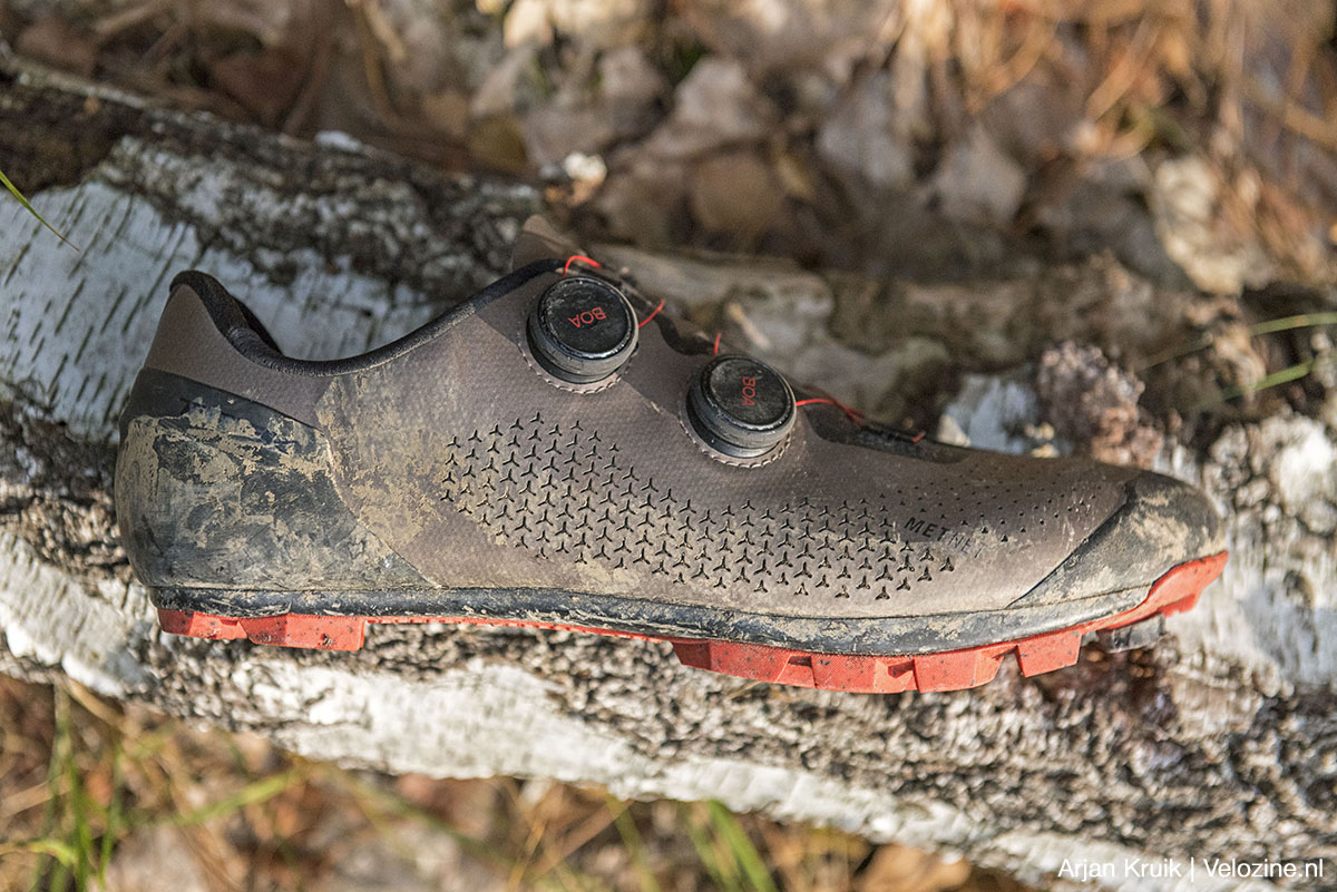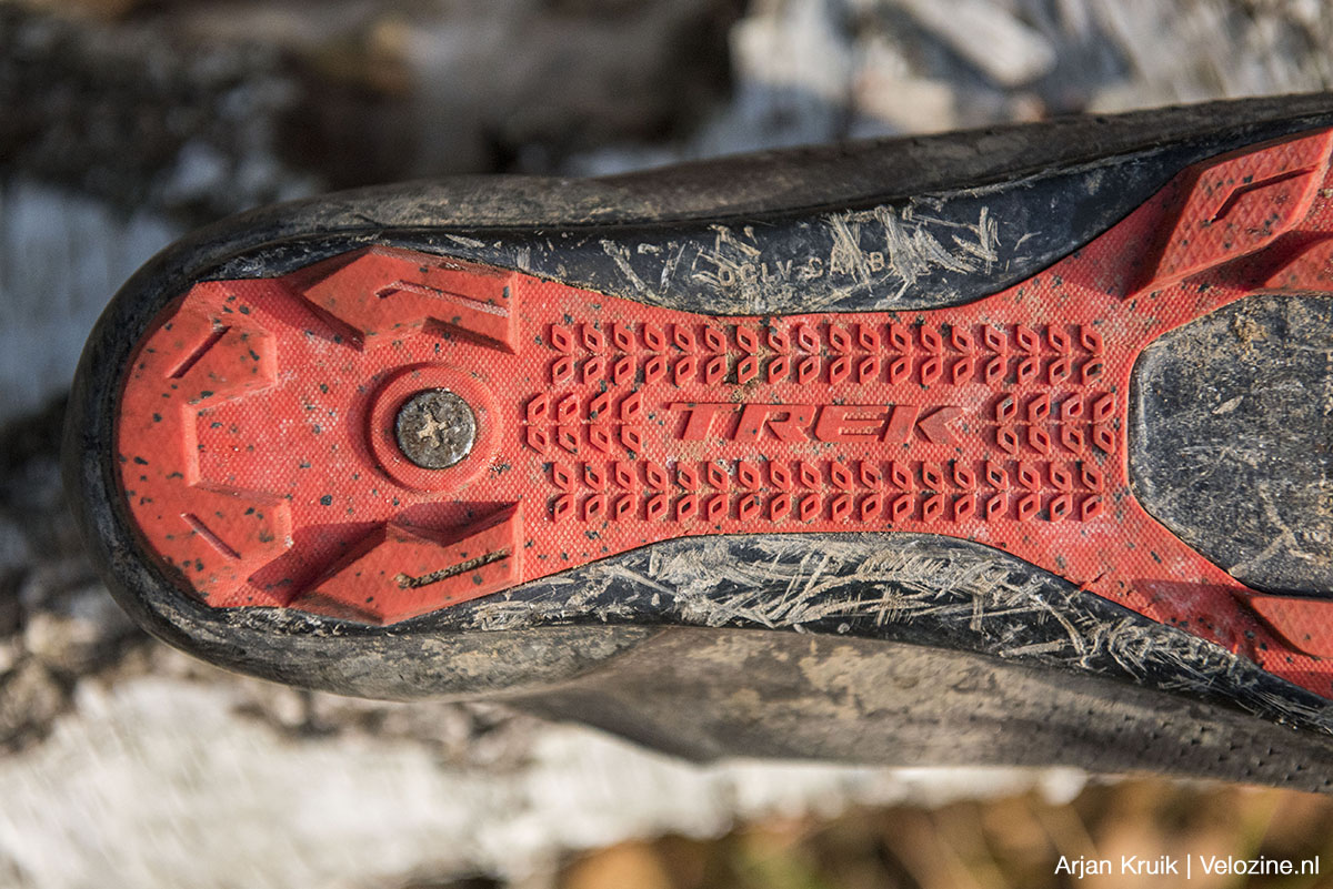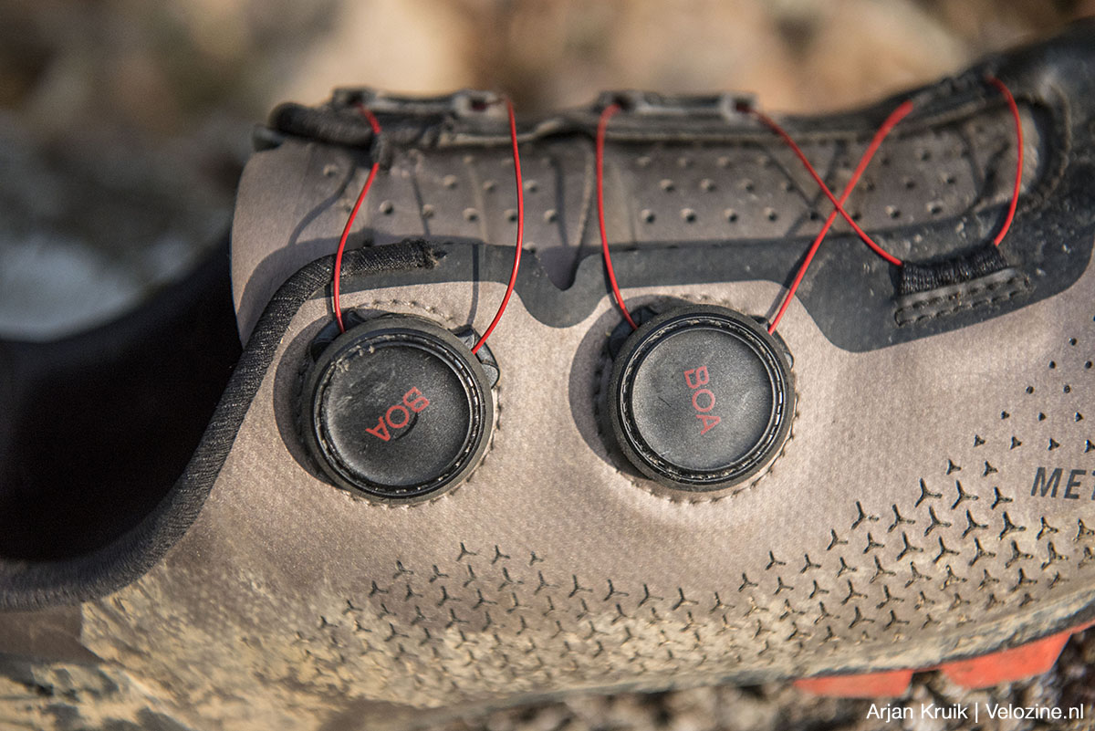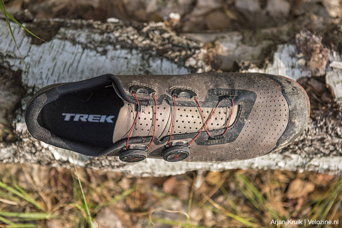 Een term als Metnet klinkt als een hoop marketing en dat ís het natuurlijk ook. Maar eerlijk is eerlijk, het gaatjesconcept van Trek werkt wel. Ik wil niet het cliché gebruiken van de schoenen de passen als een tweede huid, maar goed zitten ze zeker. Je ziet het bovenwerk soepel vervormen zodra je je voet in de schoen steek. Maar er is natuurlijk meer nodig dan een geperforeerd bovenwerk om tot een goede schoen te komen. Zo levert ook de dubbele Boa-sluiting een belangrijke bijdrage. Alhoewel een enkele Boa strakker oogt, ben ik altijd wel fan van de dubbele uitvoering. Reden: daarmee kun je nauwkeuriger de druk over de voet verdelen.