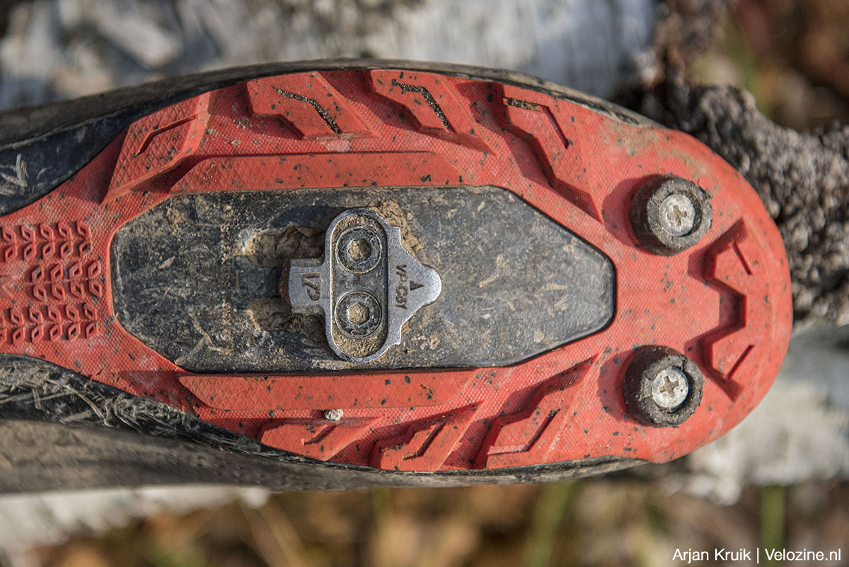 Nog even over de zool: óp het carbon zit nog een kunstrubber profielzool. Superstroef is dat rubber niet, maar het is stroef genoeg om in de meeste omstandigheden wegglijden tegen te gaan. En mocht de ondergrond naast glad ook zacht zijn, dan geven twee afneembare noppen onder de voorvoet extra houvast. Wel jammer dat de profielzool onder de voetboog niet over de gehele breedte loopt. Hierdoor ontstaan op het kale carbon al snel lelijke krassen.