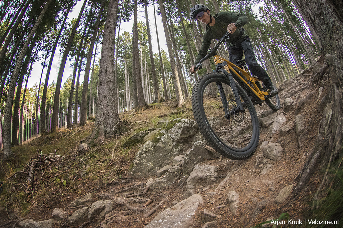Van de mogelijkheid om met een flipchip bij het onderste demperoog de progressie van de demper te beïnvloeden hebben we wél gebruik gemaakt. Het verschil tussen beide standen is niet gering. In de meer lineaire positie geeft de demper makkelijker een groter deel van z’n veerweg vrij. Met name in afdalingen met veel rotsen, losse keien en wortels vind ik dat prettig. Collegatester Sebastiaan daarentegen heeft een voorkeur voor de meer progressieve stand. Verklaarbaar, want zijn rijstijl is veel actiever en dynamischer dan de mijne. Ben ik meer het type point-and-shoot rijder dat z’n bike bij voorkeur door tricky secties laat rollen en daarbij de vering het werk laat doen, Sebastiaan kiest er meestal voor om van het ene obstakel naar het andere te hoppen. Een onderstel dat meer tegendruk en pop biedt is dan een pre. Dankzij de twee demperposities accommodeert de Fuel EX beide rijstijlen.