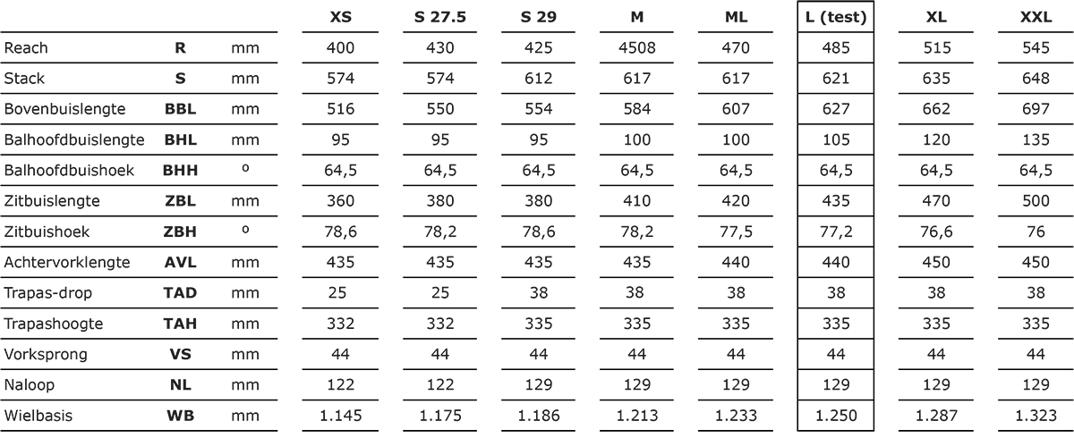 Alles bij elkaar opgeteld komen de afmetingen van de huidige L min of meer overeen met die van de oude XL. Als je dat een probleem zou vinden, dan kun je natuurlijk makkelijk downsizen. Of andersom: upsizen. Omdat Trek acht verschillende maten aanbiedt, zijn de verschillen tussen die maten relatief klein. En omdat de zitbuizen door de hele maatserie heen korter zijn dan voorheen – op onze L slechts 435 millimeter – kun je probleemloos een maat groter of kleiner pakken. Een kortere als je voor meer wendbaarheid gaat. Of een langere als je nog meer stabiliteit zou willen. Wil je het naadje van de kous weten? Je vindt onderaan deze test een compleet geometrieoverzicht van alle framematen. En Trek biedt zelf op z’n website een dynamisch overzicht, met voor iedere mogelijke geometrieconfiguratie een aparte tabel.
