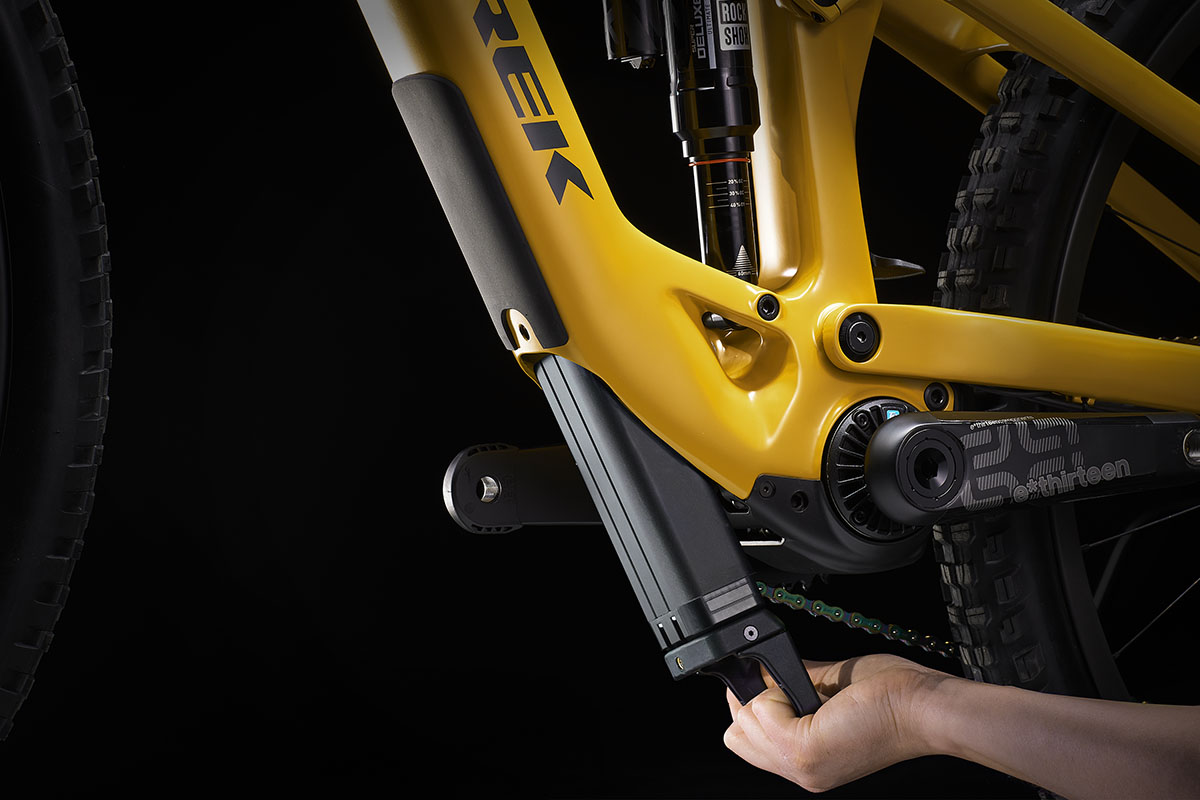 Een kleine motor en compacte accu resulteren echter ook in minder ondersteuning en een kleinere actieradius. De HPR50-motor – gepositioneerd rond de trapas – levert slechts 50 Nm kopppel. Dat is 35 Nm mínder dan je bij middenmotoren krijgt op reguliere mountainbikes. En waar je op zo’n dikke e-mtb tegenwoordig minimaal een 720 Wh accu hebt, heeft Trek de Fuel EXe een exemplaar met een capaciteit van ‘maar’ 360 Wh. Dat is dus flink kleiner. En… dat merk je. Maar daarover later meer. Een in de bidonhouder te monteren range-extender geeft je eventueel nog eens 160 Wh extra. Daarmee verleng je het bereik van de accu in onderbuis – goed voor 2 tot 5 uur – met zo’n 40%.