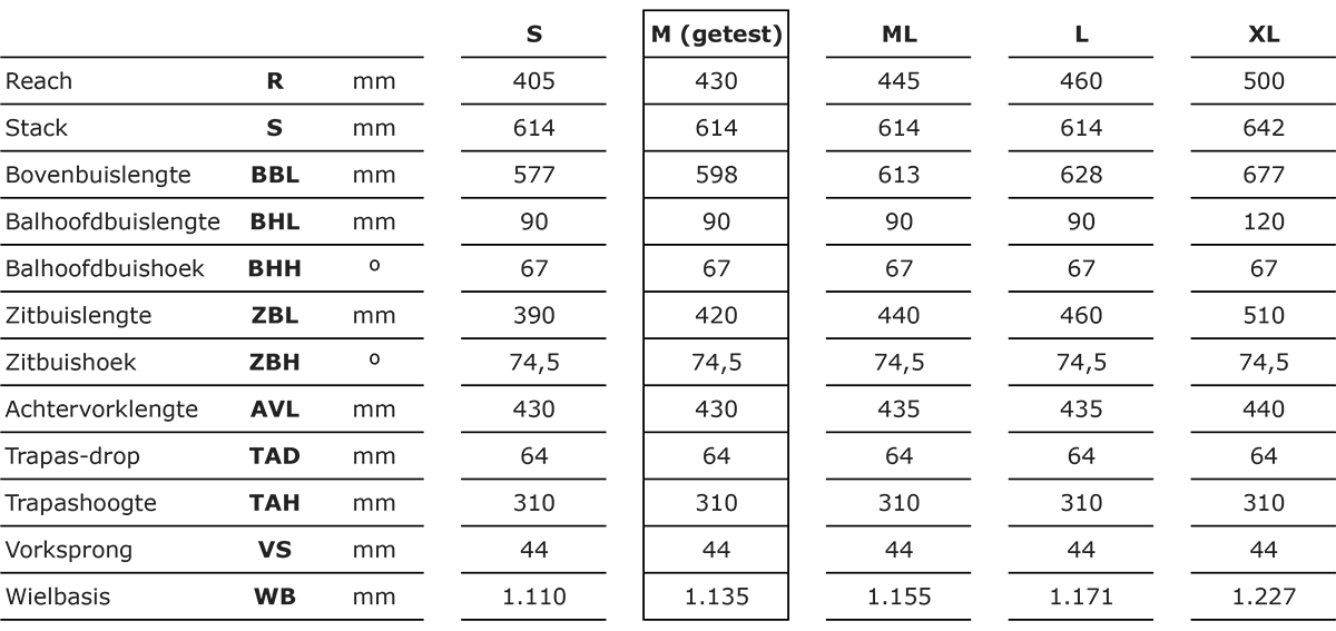 De balhoofdbuis is net zo lang gebleven. Of beter, net zo kort: 90 millimeter. Maar omdat de nieuwe Procaliber maar liefst 120 millimeter veerweg meekrijgt, is de stack toch hoger: van 600 millimeter 614 millimeter. De lengte van de liggende achtervork is met 430 millimeter onveranderd. Opvallend: binnen de maatreeks groeit de liggende achtervork nu mee. Maat S en M hebben een liggende achtervork van 430 millimeter, de ML en de L komen op 435 millimeter en de XL heeft 440 millimeter.