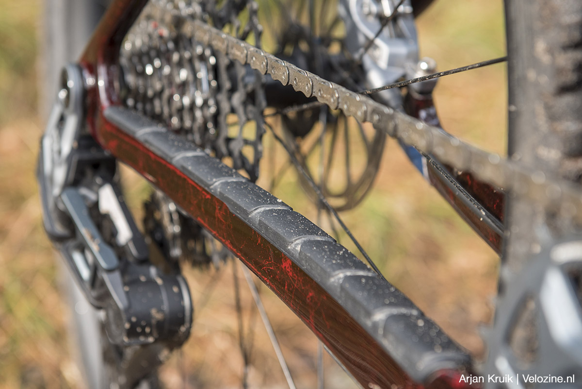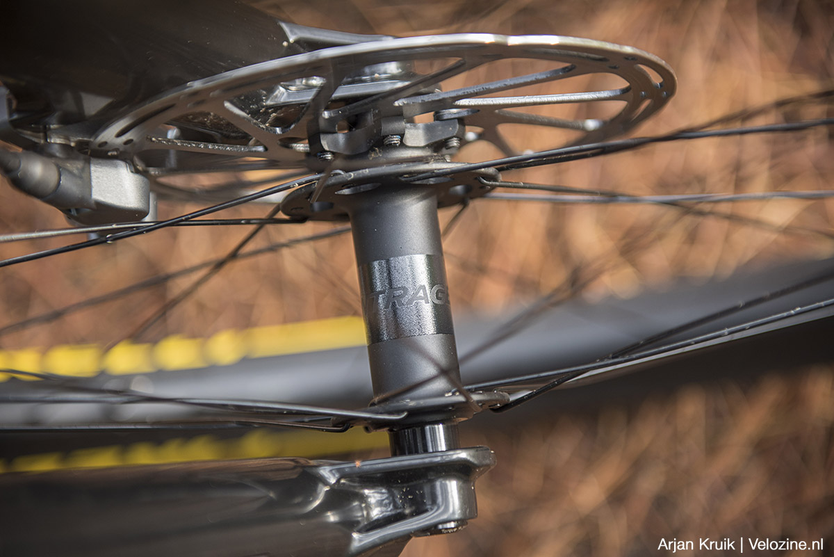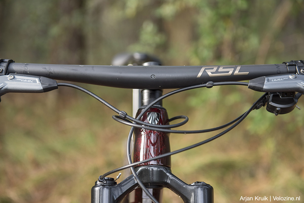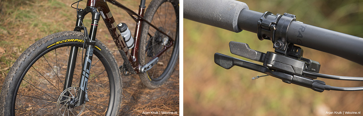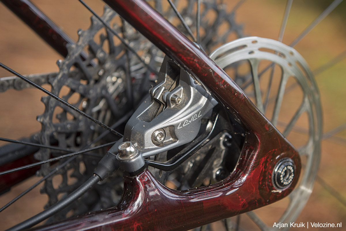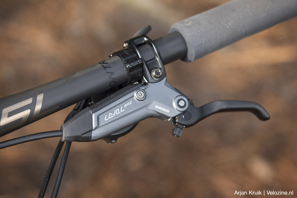 De hydraulische remmen komen eveneens bij Sram vandaan: Levels in de Stealth Bronze-uitvoering. Dat stealth in de modelnaam staat voor de kabelrichting: niet van het stuur áf gericht, maar juist naar het stuur toe. Dat moet in combinatie met een geïntegreerde kabeldoorvoer een strakkere cockpit opleveren, maar eerlijk gezegd is eerder het omgekeerde het geval: de voorremkabel toucheert het peperdure carbon stuur. Los van de twijfelachtige optiek blinken de Levels ook niet uit in remkracht en ausdauer. Voor gebruik in de Dutch Mountains is dat geen probleem, maar wie z’n bike regelmatig over de grens uitlaat moet er wel rekening mee houden.