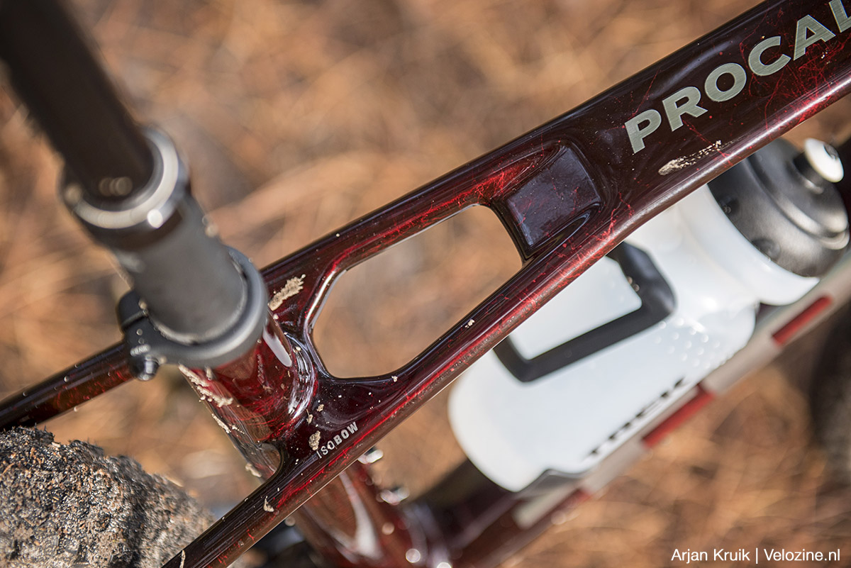 Ook beter dan gemiddeld is de controle die de nieuwe Procaliber biedt als de paadjes steiler en technische worden. Ik kwalificeer mijzelf absoluut niet als een trailtijger. Integendeel. Maar juist daardoor valt op dat de Procaliber van de derde generatie heel veel vertrouwen biedt. In lastige afdalingen plaatsen de lange reach en de luie balhoofdbuishoek m’n zwaartepunt comfortabel achter de vooras, waardoor het onaangename gevoel van bijna over de kop gaan achterwege blijft. Sterker: de capabele geometrie, de lange voorvork, de volumineuze banden en zéker ook de dropperpost moedigen me aan om steeds sneller af te dalen. Wat dat betreft is de nieuwe Procaliber duidelijk superieur aan z’n voorganger. Alleen jammer dat de remmen het laten afweten; vanwege hun matige stopkracht moet ik telkens eerder en harder in de remhendels knijpen dan strikt genomen noodzakelijk zou moeten zijn.