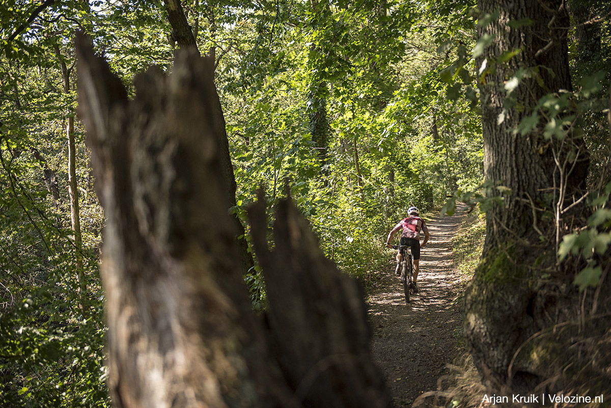 Ik heb de Trek Procaliber voornamelijk gereden op de Brabantse Wal en omstreken, met een mix van rechte oldskool-routes en slingerende singletracks. Wie bang is dat de derde generatie Procaliber vanwege z’n gemoderniseerde geometrie minder geschikt is geworden voor dit soort typisch Nederlandse omstandigheden, kan opgelucht ademhalen. Ouderwets rechte secties met haakse bochten zijn geen probleem. Je hoeft aan het eind van zo’n bocht maar te denken aan accelereren en de lichtvoetige Trek schiet al vooruit. En sturen doet-ie op de vierkante centimeter.