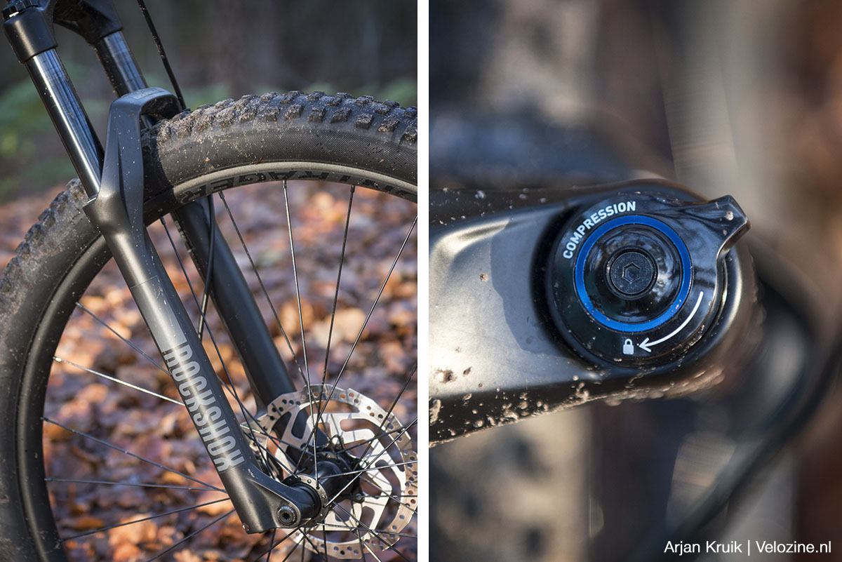 Is de geometrie van de X-Caliber gericht op het creëren van een wendbare, levendige crosscountrybike, de maten van de Roscoe staan in dienst van de afdaalkwaliteiten op spannende trails. Om die reden is er ook een voorvork met 140 mm veerweg in de balhoofdbuis gestoken. Dat is veel veerweg, maar niet té veel. Immers, het is uiteindelijk de énige vering die je hebt. Mijn ervaring is dat je dit soort fietsen meer over het voorwiel rijdt dan een fully. De achterkant hobbelt er gewoon achteraan. Vandaar ook dat brede stuur op de Roscoe; dat heb je nodig om de bike ferm op koers te houden.