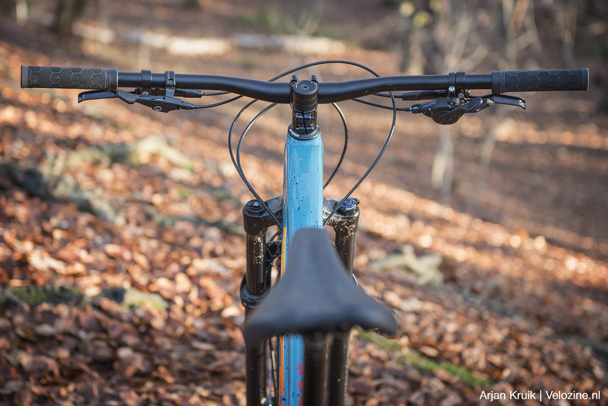 Die 140 mm veerweg relativeert ook de op het oog radicale geometrie van de Roscoe. Immers, bij 25% negatieve veerweg – dat is de mate waarin de vork inzakt als je op het zadel gaat zitten – wordt de balhoofdbuishoek al snel anderhalve graad steiler. Hierdoor is de Roscoe wendbaarder dan je op grond van de kale cijfers zou verwachten. Zonder overigens in te leveren op zekerheid: het over-de-kop gevoel – dat veel xc-hardtails in lastige afdalingen kenmerkt – blijft bij de Roscoe geheel achterwege. Dat brengt me alweer bij de rijeigenschappen. Maar voordat ik daar wat over vertel, loop ik hieronder eerst even de uitrusting van de Roscoe 7 met je door.