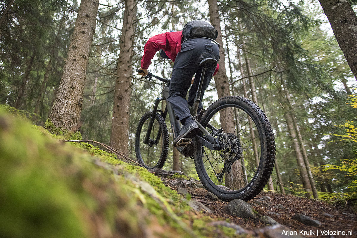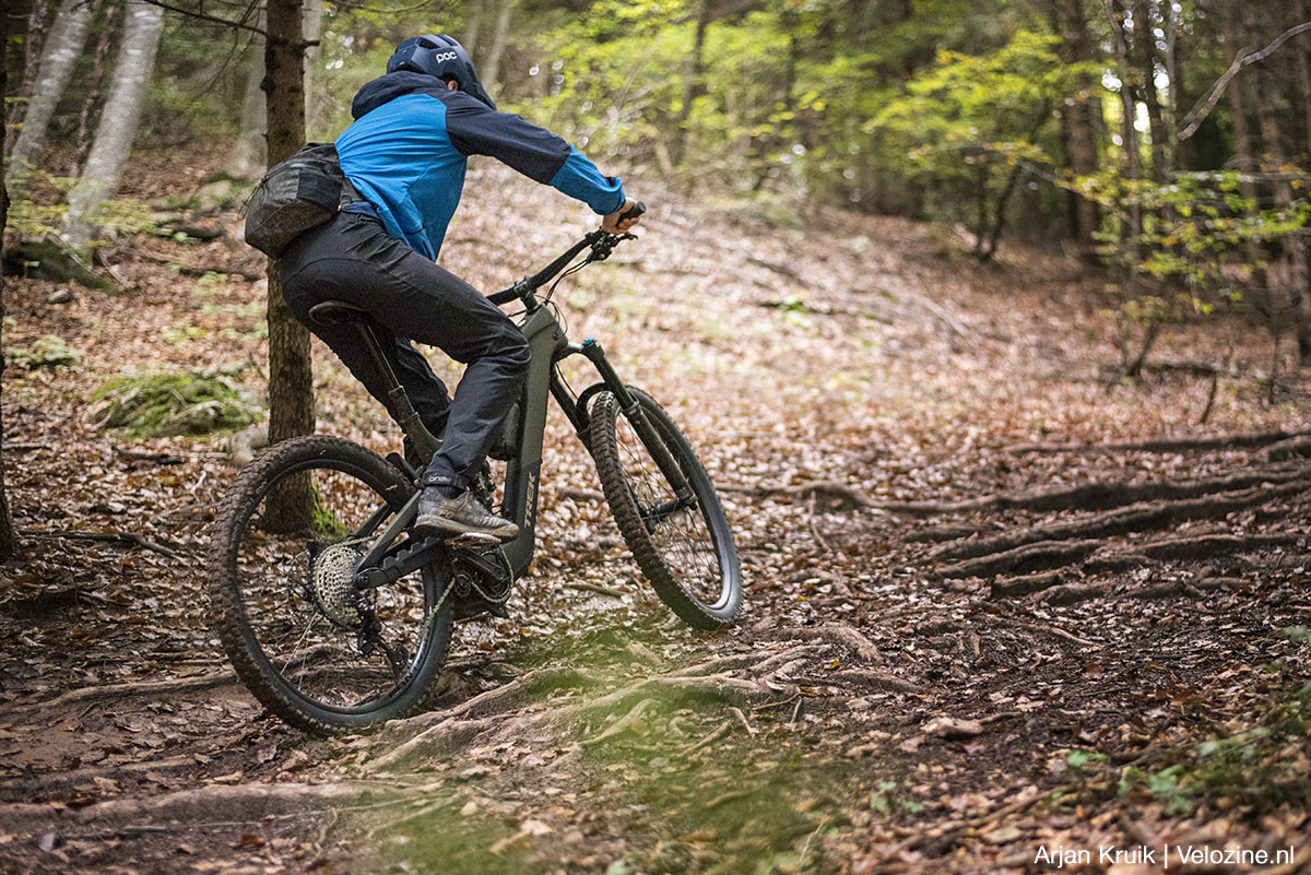 Klimmen doet de Slash+ dus veel beter dan ik op basis van de kale cijfers had verwacht. Een fijne bijkomstigheid, maar ook niet meer dan dat, want uiteindelijk koop je een bike als de Slash+ omdat je zoveel mogelijk wilt afdalen. En dalen, dat kan je wel aan ‘m overlaten. De achtervering reageert niet alleen gevoelig op kleine oneffenheden, maar absorbeert ook enthousiast de grofste rotsen en dikste wortels, zónder daarbij door z’n gehele veerweg te jassen. Door dat gevoel van eindeloze veerweg, gecombineerd met een precies stuurgedrag en een hoge mate van stabiliteit, rijd je zelfs de ruigste paden met twee vingers in je neus. Oprecht, nog nooit eerder reed ik met een bike waarop afdalen gevoelsmatig zo makkelijk is.
