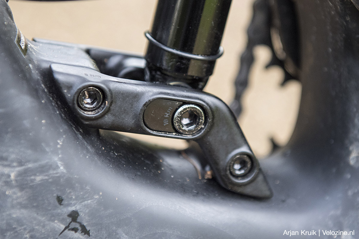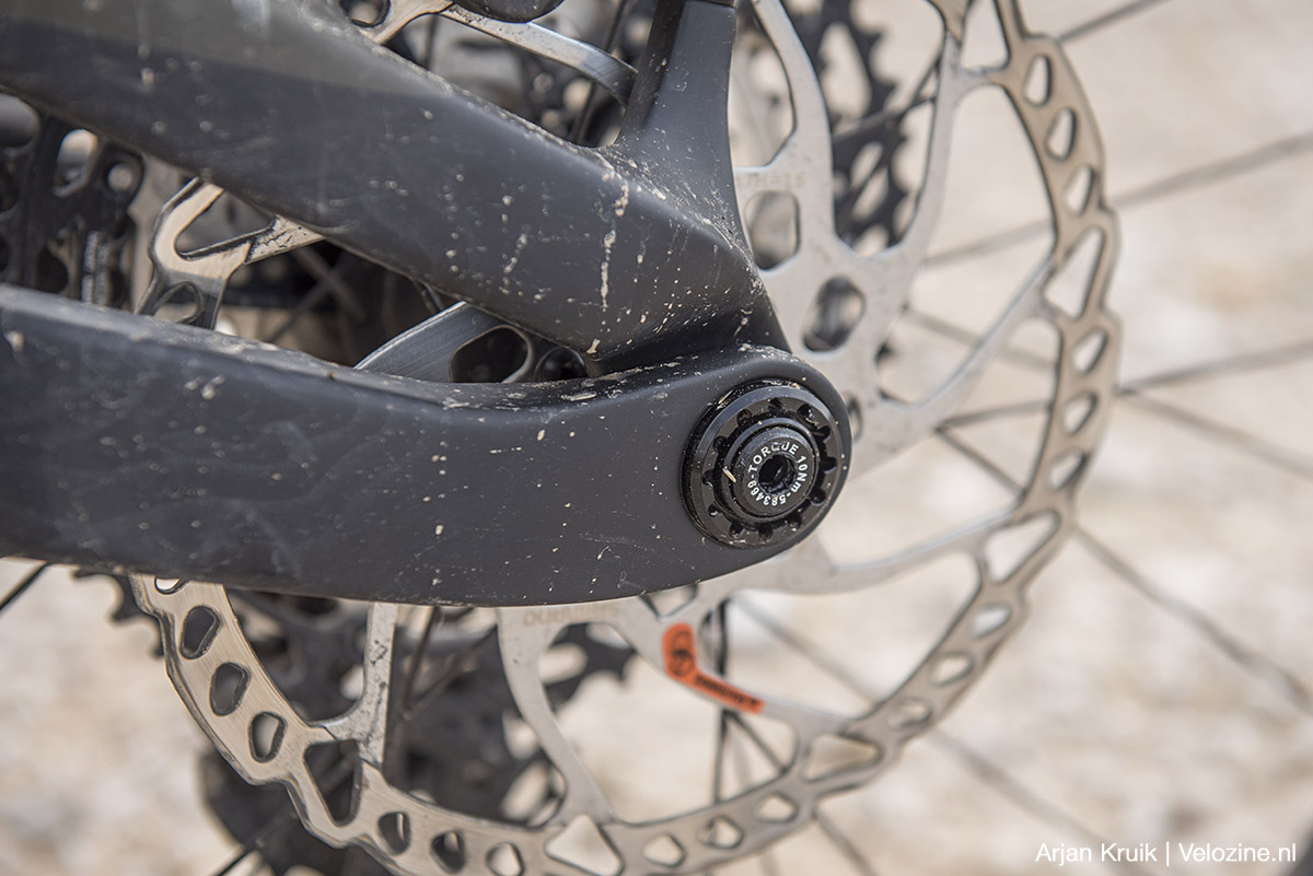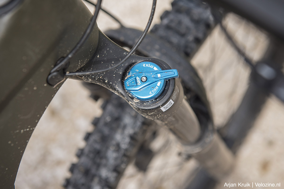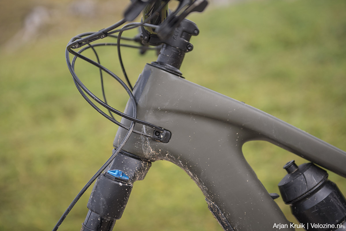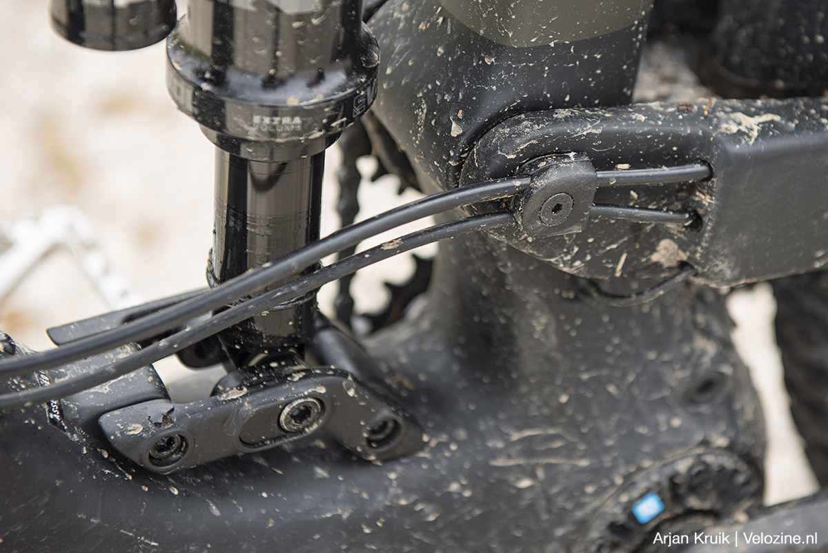 Door middel van een excentrische lagerschaal is de balhoofdbuishoek plus of min 0,8 graad verstelbaar ten opzichte van de neutrale positie waarmee de Slash+ af fabriek geleverd wordt. In de vlakste stand komt de balhoofdbuishoek op 62,6 graden, de steilste stand levert 64,2 graden op. En uiteraard veranderen door de hoekaanpassing ook zaken als wielbasis, zitbuishoek en trapashoogte. Echter, dat alles in geringe mate. Omdat ik geen excentrische lagerschaal bij de hand had tijdens deze test – het is een optie, geen standaard uitrusting –, heb ik niet kunnen uitvinden in hoeverre de aanpassingen invloed hebben op de rijeigenschappen.