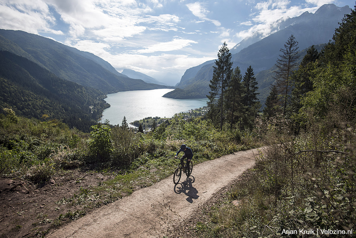 Dolomiti Pagenella is een gebied even ten noorden van het Gardameer. Als je bovenop de Cima Paganella staat kun je het Gardameer zien liggen. Maar ze hebben er ook een eigen meer, het Lago di Molveno. En je kunt er geweldig mountainbiken. Het hele gebied ligt vol paden. Specifieke biketrails die met liften toegankelijk zijn. Maar ook natuurlijke sentieri die je alleen maar kunt bereiken als je zelf bereid bent te trappen. Voor een lichtgewicht trailbike als de Top Fuel is het een ideaal testgebied. Omhoog gaat de dubbelgeveerde Amerikaan als een malle. De zitpositie is prettig centraal en er staat, op de allersteilste klimmetjes na, voldoende druk op het voorwiel. Dankzij het kleine voorblad met maar dertig tanden zijn de lichte verzetten ook écht licht. En de vering werkt uitstekend; de demper zakt niet in, oneffenheden worden goed geabsorbeerd, de tractie is voorbeeldig en van wippen is nauwelijks sprake.