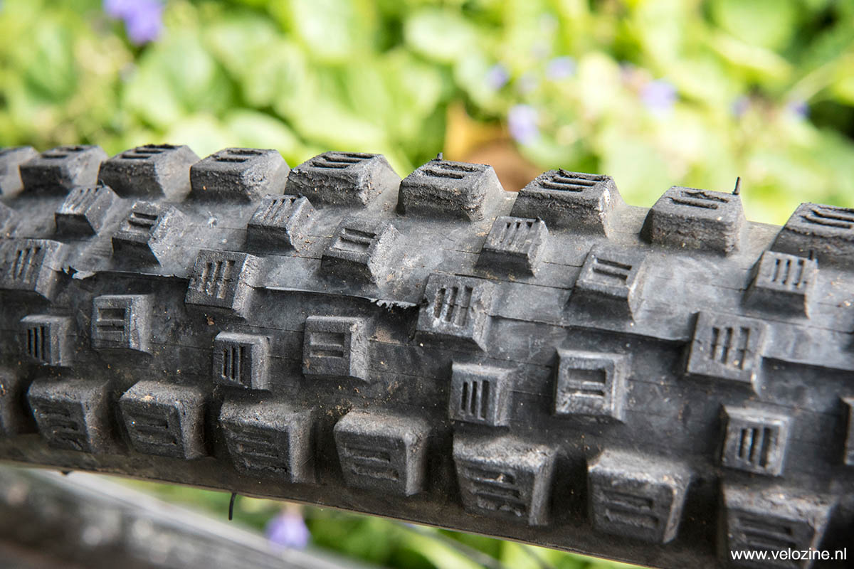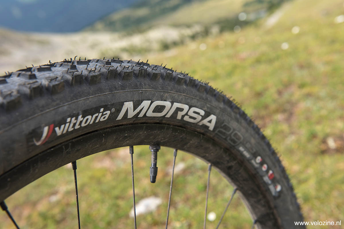 Op het voorwiel een Vittoria Martello in de maat 29 x 2.35 inch, achter een Morsa in 29 x 2.30 inch. De reden voor die keuze is evident; de Martello is door Vittoria zowel op het loopvlak als aan de zijkanten van relatief grove noppen voorzien, wat in mijn optiek veel grip belooft. Maar met relatief weinig ruimte tussen die noppen, om de rolweerstand toch binnen de perken te houden. De Vittoria Morsa daarentegen is bijna een semi-slick, met een loopvlak van subtiele noppen in een klassieke V-opstelling, om de rolweerstand zo laag mogelijk te houden. Een rij dikke zijnoppen aan weerszijden van het loopvlak zou in snelle bochten wegglijden moeten tegengaan.