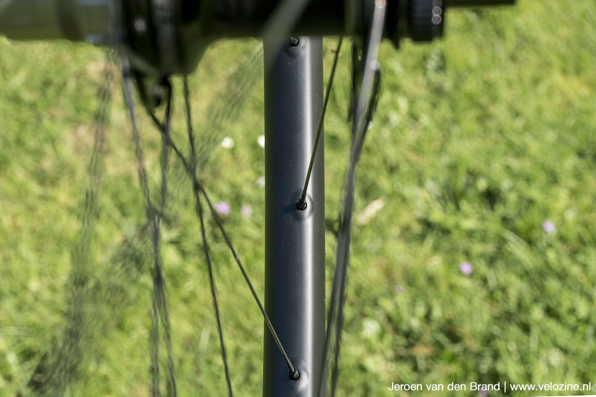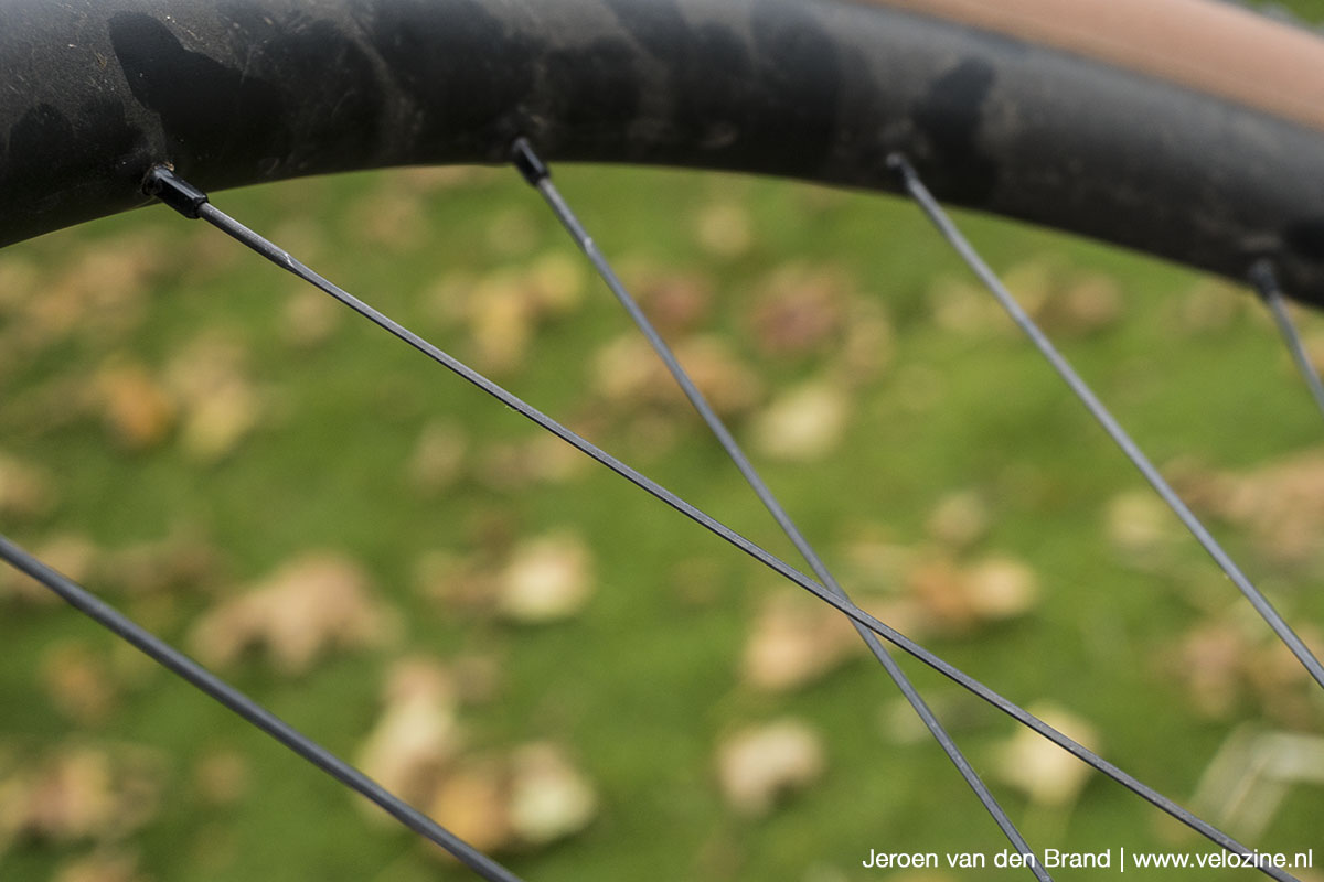 WTB monteert een nylon strip in het laagste deel van de velg. Daarmee worden de spaakgaten extra afgedicht. Dat laagste deel van de velg heb je vooral nodig om een band in eerste instantie om de velg te krijgen. En dat is bij de CZR i23 gravelwielen iets meer geworstel. Meermaals riep ik de hulp in van een bandenlichter. Eenmaal beide hieldraden in de centrale geul, gaat op de velg ‘ploppen’ van de band zelfs met een vloerpomp gekoppeld aan presta-ventielen juist betrekkelijk gemakkelijk. Al gaat telkens één zijde van de band iets minder overtuigend naar z’n plek. Het is ook precies deze kant die vervolgens bij het afnemen het strakst op z’n plek blijft. Door het asymmetrische velgprofiel is één van de schouders in het velgprofiel namelijk breder. En die zorgt daarmee dus voor een grotere houvast op de hieldraad.