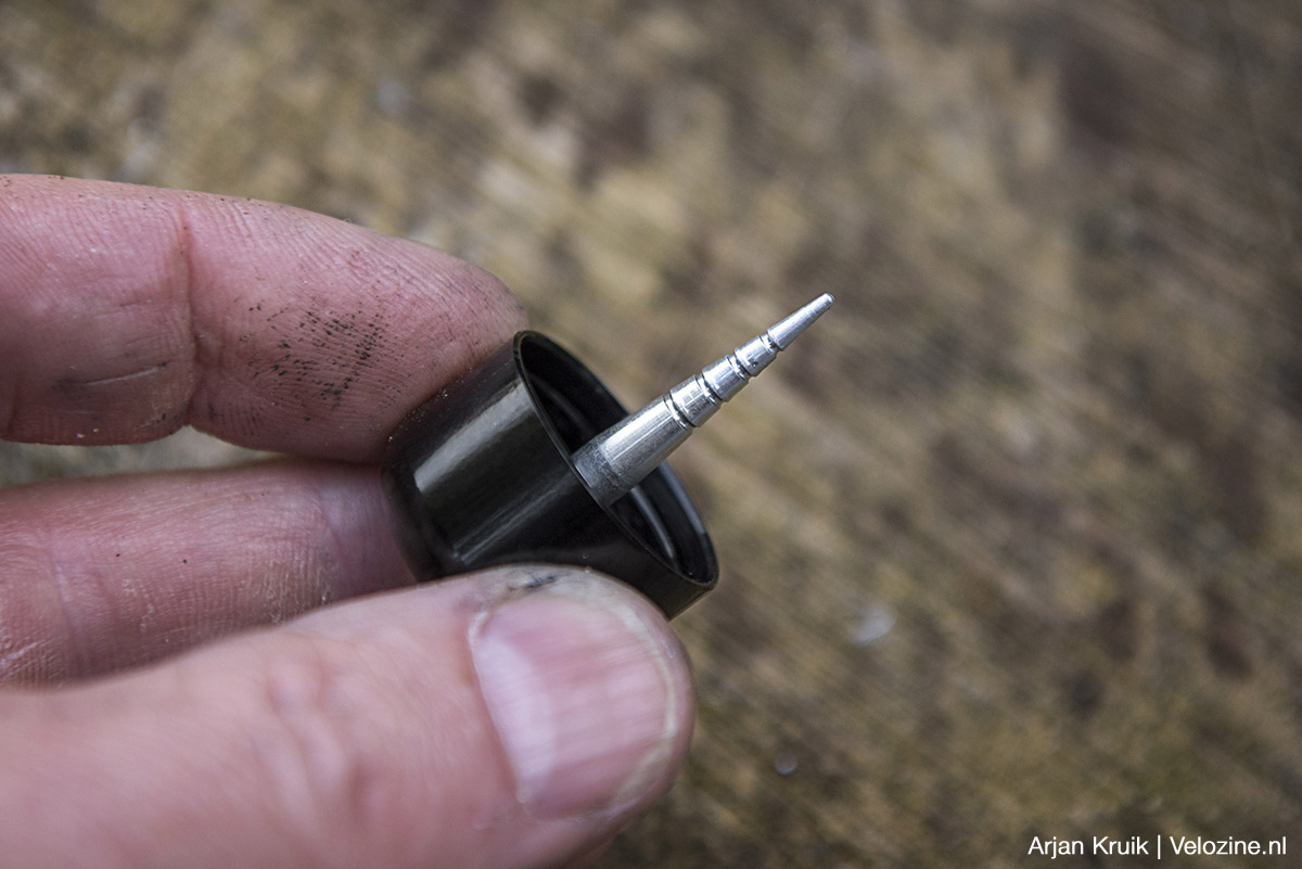 Over ankertje gesproken: dit puntige lichtmetalen piefje blijft dus, nadat je de plug hebt aangebracht, ín de band achter. Dat is een groot verschil met ‘plugnaald’ die een open, vorkvormige punt hebben. Dit soort naalden kun je, nadat je de plug hebt aangebracht, weliswaar weer uit de band trekken zonder dat er een ankertje in de band achterblijft, maar die vaak wat brede punt kan het lastiger maken de naald door het gaatje in de band te prikken. Plus: het komt voor dat je met het terugtrekken van zo’n open plugnaald óók de plug weer terugtrekt. Qua gebruiksgemak is het systeem van WTB wat mij betreft dus superieur.