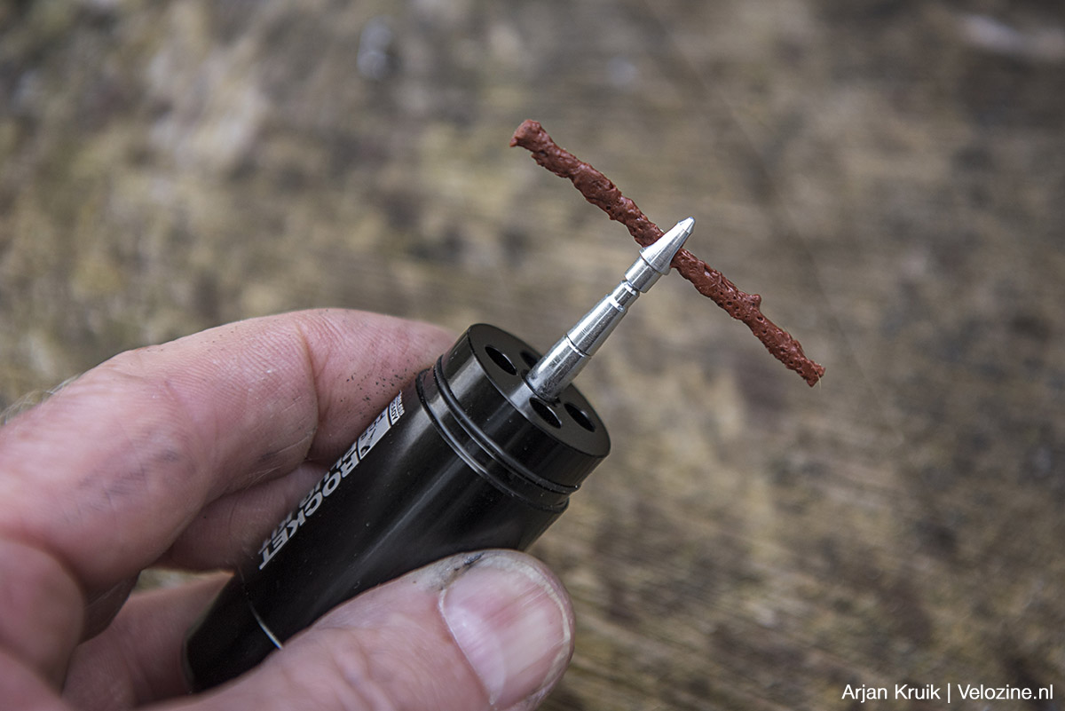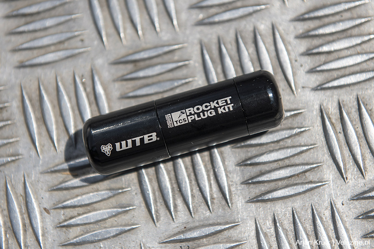 Ook bij de Schwalbe Wicked Will die we onlangs hebben getest is die afweging gemaakt. Omwille van het lagere gewicht en de grotere souplesse koos ik voor Schwalbe’s Supergroud-karkas en niet voor het stevigere maar zwaardere Trail-karkas. Tijdens de test zelf leverde die keuze geen problemen op, terwijl we er toch behoorlijk uitdagend terrein mee hebben gereden in de Italiaanse Alpen. Echter, tijdens een tripje ná de publicatie van de test van de Wicked Will, naar het befaamde trailcenter van het Zuid-Tiroolse Kronplatz, ging het toch nog mis: lek! Alsof de duvel er mee speelt, want ik heb toevallig net een nieuwe gadget bij me: de TCS Rocket Plug Kit van WTB.