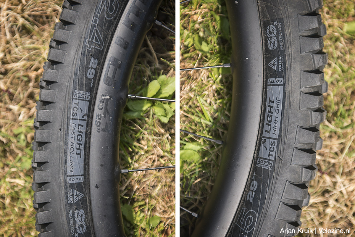 Tot slot is er nog de compound, de rubbersamenstelling. Die wil je bij een trailbike aan de voorkant liefst wat zachter en stroever hebben, voor meer grip. En aan de achterkant wat harder, voor een lagere rolweerstand en minder slijtage bij remmen. Ook hier biedt WTB twee opties: ‘TriTec High Grip’ en ‘TriTec Fast Rolling’. Met de term ‘TriTec’ geeft WTB aan dat in een band drie verschillende rubbermengsels gebruikt worden. Een harde onderlaag, iets minder hard op het loopvlak en nog iets zachter bij de schoudernoppen. De termen high grip en fast rolling spreken voor zich. Bij de eerste is het rubber op het loopvlak wat zachter dan bij de tweede. Dat maakt de keuze simpel: ‘mijn’ Vigilante komt met TriTec High Grip-, de Trail Boss met Tritec Fast Rolling-rubbersamenstelling.
