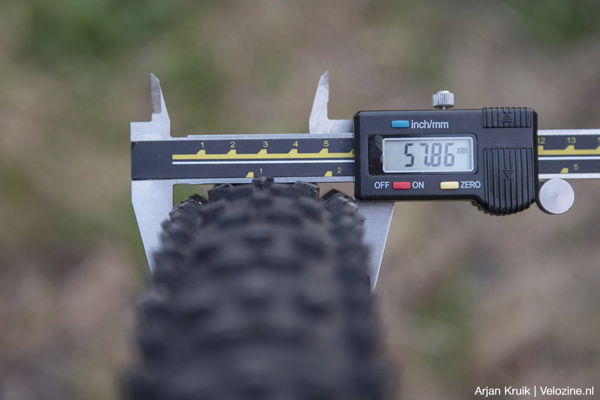 Dan het karkas. WTB heeft twee smaken: ‘Light’ en ‘Tough’. Het verschil is dat de tough-versie een extra karkaslaag heeft. Dat maakt de band sterker en stugger. Maar ook zwaarder. Ik wil de banden op een trailbike én op een e-mtb gaan proberen. Op die laatste is extra massa geen probleem, maar op een spierfiets wel. Ik kies daarom voor het lichtste karkas. Nou ja, licht: bij meting blijkt de Vigilante 2.5 toch nog 1.105 gram te wegen. De Trail Boss 2.4 komt op 978 gram. Tel daar voor de uitvoering met zwaarder karkas maar zo’n 250 gram bij op, per band.